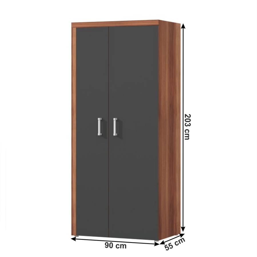 Anyag: laminált DTD Szín: szilva/szürke grafit Méretek (SzéxMéxMa): 90x55x203 cm 2 ajtós 2 felső polc 2 akasztórúd Szétszerelve szállítva