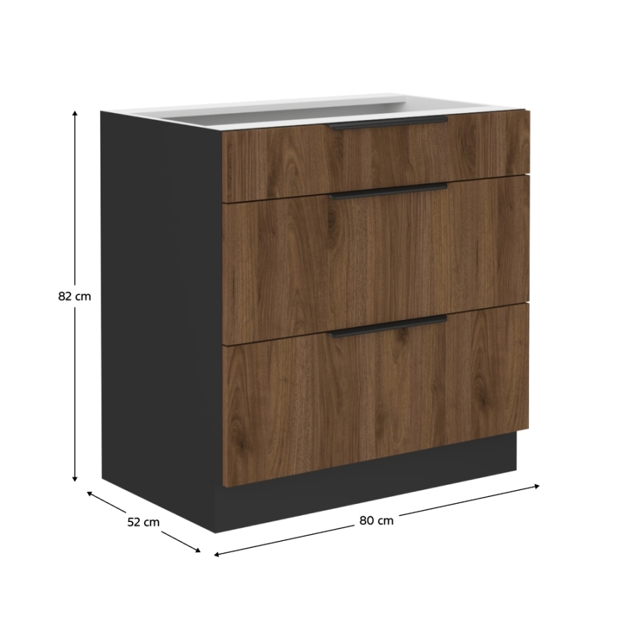 Az alsó szekrényeket az alsó sínnel együtt szállítjuk, asztallap nélkül.