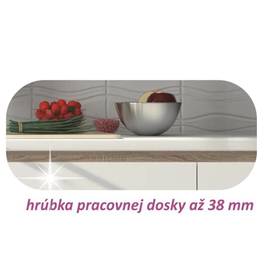 a munkalap 38 mm vastag. Minden alsó szekrény munkalappal és alsó léccel van szállítva. Vásárolható hozzá univerzális (B/J) mosogató LAY ON.
