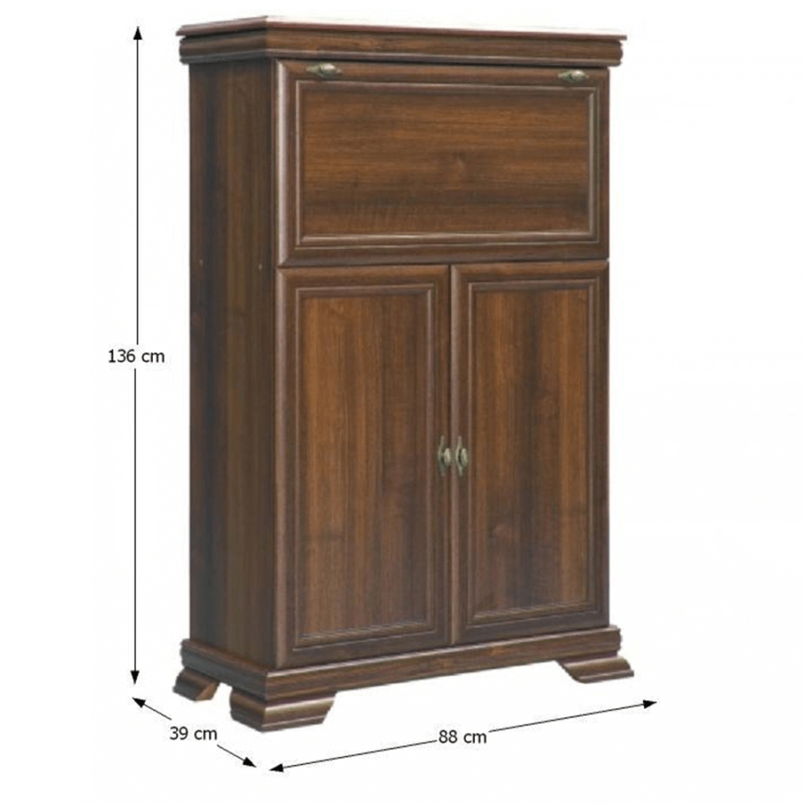 Bárszekrény - ideális az ebédlő, étkező, háló vagy dolgozószoba berendezéséhez. A KORA rusztikus bútorcsaládból, könnyen kombinálható elképzelése szerint. Két ajtóval és egy tárolórekesszel rendelkezik. Anyaga:laminált DTD Színváltozat: samoa king Méretek (SzéxMaxMé): 88x136x39 cm Az alsó tér magassága a padlótól: 10,5 cm Lapraszerelten szállítva