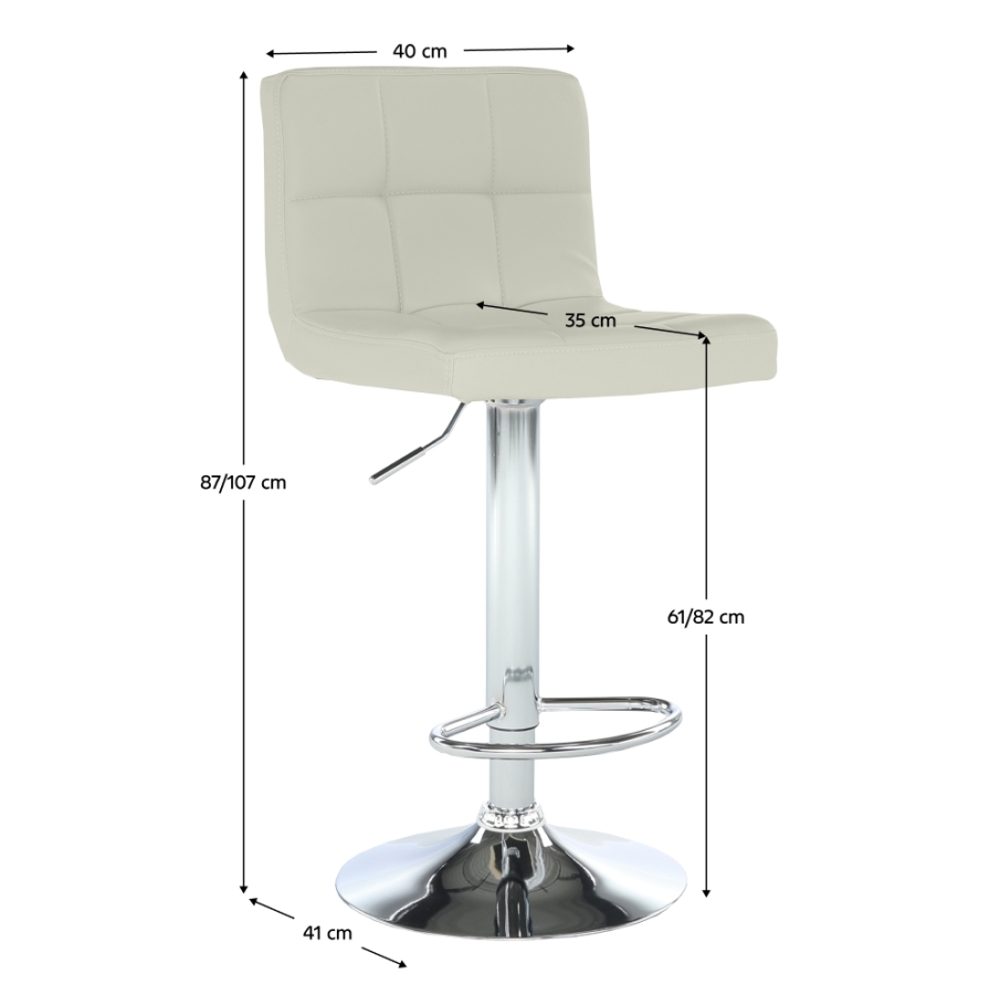 Bárszék KANDY NEW Anyag: műbőr/króm A szövet kopásállósága: 100 000 Martindale Színe: bézs Méretek (SzéxMéxMa): 40x41x87x107 cm Ülőrész magassága: 61x82 cm Ülőrész mélysége: 37 cm Teherbírás 100kg Szállítás szétszerelve
