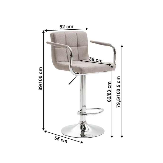 Bárszék LEORA 2 NEW Anyag szövet/fém. Szín: szürkésbarna taupe/krómozott Méretek (SzéxMéxMa): 52x55x89-100 cm Ülőrész magassága: 62-83 cm Ülőrész mélysége: 39 cm Magasság a földtől a kartámla tetejéig: 79,5-100,5cm Szállítás szétszerelve.