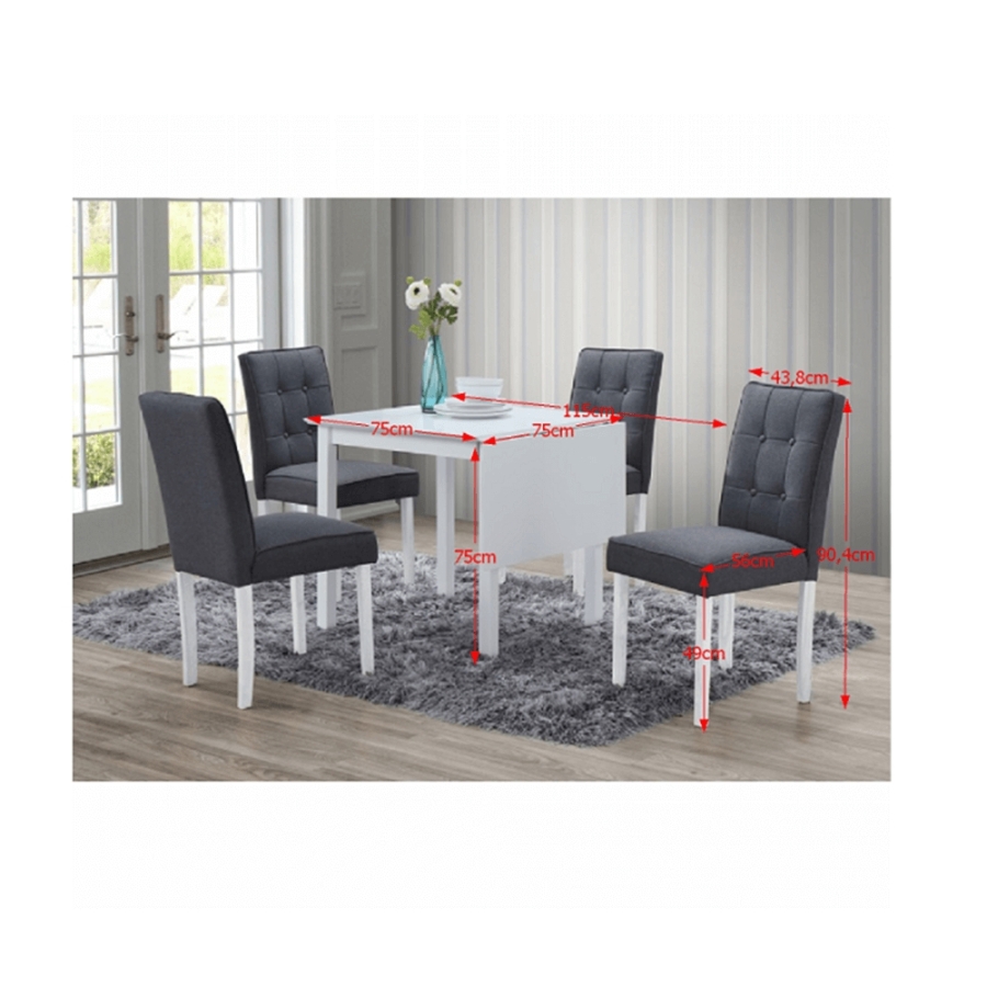 A készlet egy asztalból és négy kárpitozott székből áll.