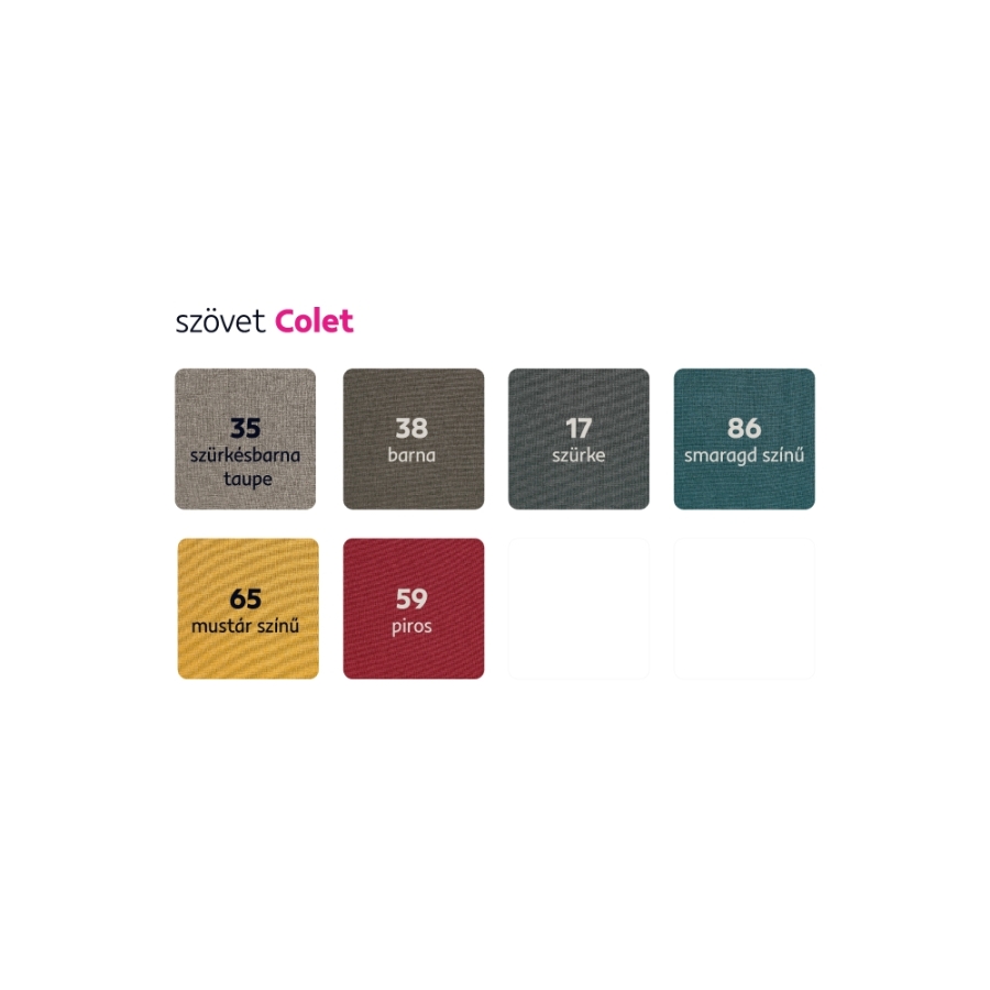 Rendelhető a Colet szövet színválasztékában.Egyedi megrendelés esetén szükség van az adott összegnek a 10%-át befizetni,mint előleg. Az előleg befizetése után az Ön követelményét benyújtjuk a gyártóna. Szállítási idő 8-10 hét.