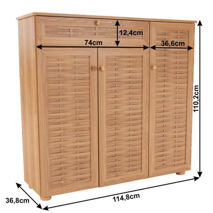 FP 04 cipősszekrény fiókkal Anyaga: laminált MDF / tömörfa ajtók Színe: natúr bükk Méretek (SzéxMéxMa): 114,8x36,8x110,2 cm Fiók mérete (SzéxMéxMa): 74x36,8x12,4 cm