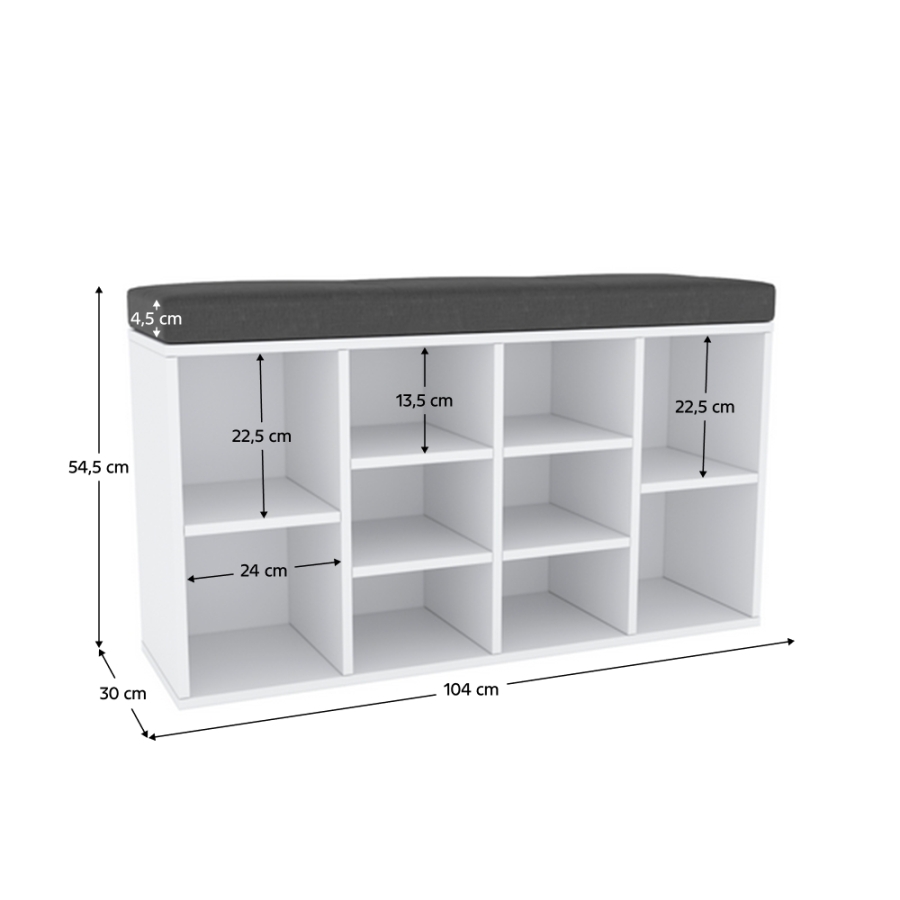 Anyag: laminált DTD Szín: fehér Méretek (SzxMéxMa): 104x30x54,5 cm polcokkal Cipőpolc teherbírása: max. 90 kg Polc teherbírása: max. 7 kg Bontásban szállítva