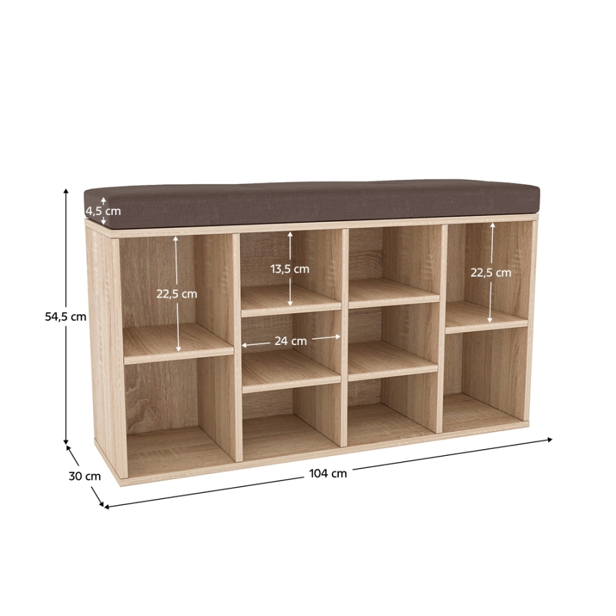 Anyag: laminált DTD Szín: sonoma tölgy Méretek (SzxMéxMa): 104x30x54,5 cm polcokkal Cipőpolc teherbírása: max. 90 kg Polc teherbírása: max. 7 kg Bontásban szállítva