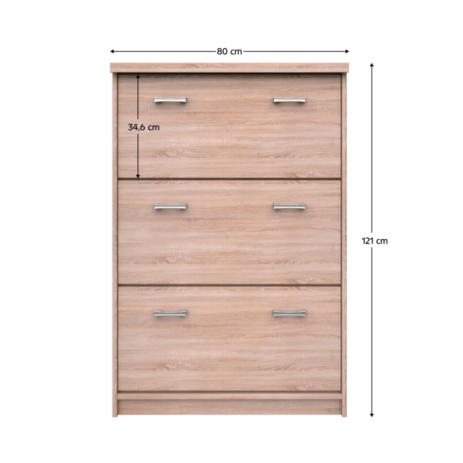Cipősszekrény 3K TOPTY TYP 24 Anyag: laminált DTD Szín: sonoma tölgy Méretek (SzxMéxMa): 80x27x121 cm Három billentős fiók Szétszerelve szállítva
