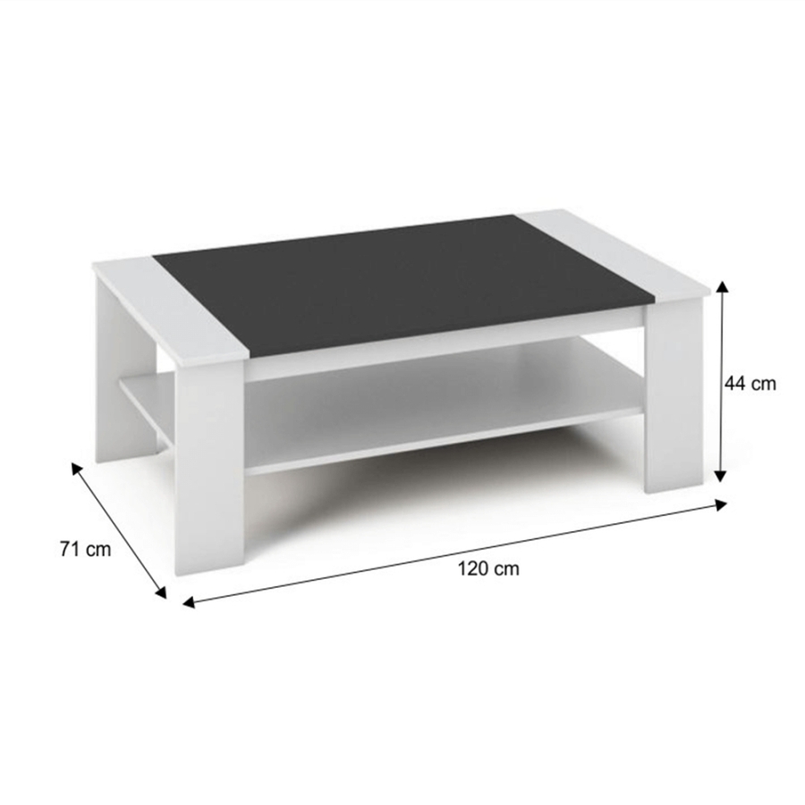 Dohányzóasztal BAKER Anyag: laminált DTD/ABS élek Változat: fehér/fekete Méretek (SzéxMéxMa): 120x71x44 cm Szállítás szétszerelve.