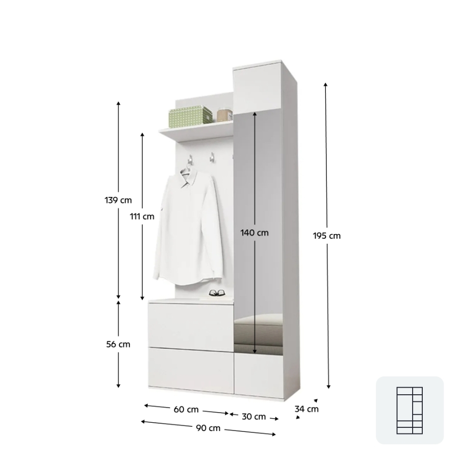 Anyag: laminált DTD Szín: fehér Méretek (SzéxMéxMa): 90x34x195 cm Billenő cipőtartóval Tükörrel Polcos szekrénnyel Fogas elem PUSH - UP nyitás ABS élek Akasztós rész Szállítás szétszerelve