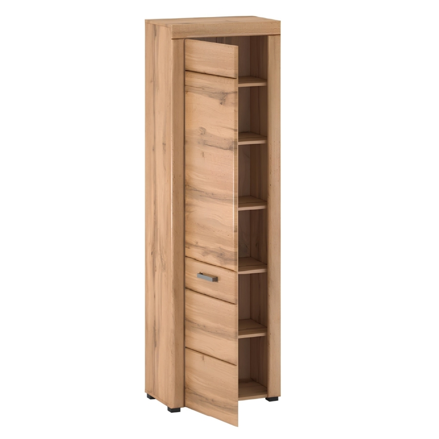 Anyag: laminált DTD/MDF/fém Színkivitel: appalachian tölgy Méretek (SzxMéxMa): 60,8x37x196 cm Anyag vastagsága: 1,9 cm Polc teherbírása: 5 kg Fém fogantyúval Egyajtós Zárt Polcos 5 polc Sok tárolóhely Elegáns lábak Minőségi kidolgozás Bontásban szállítva