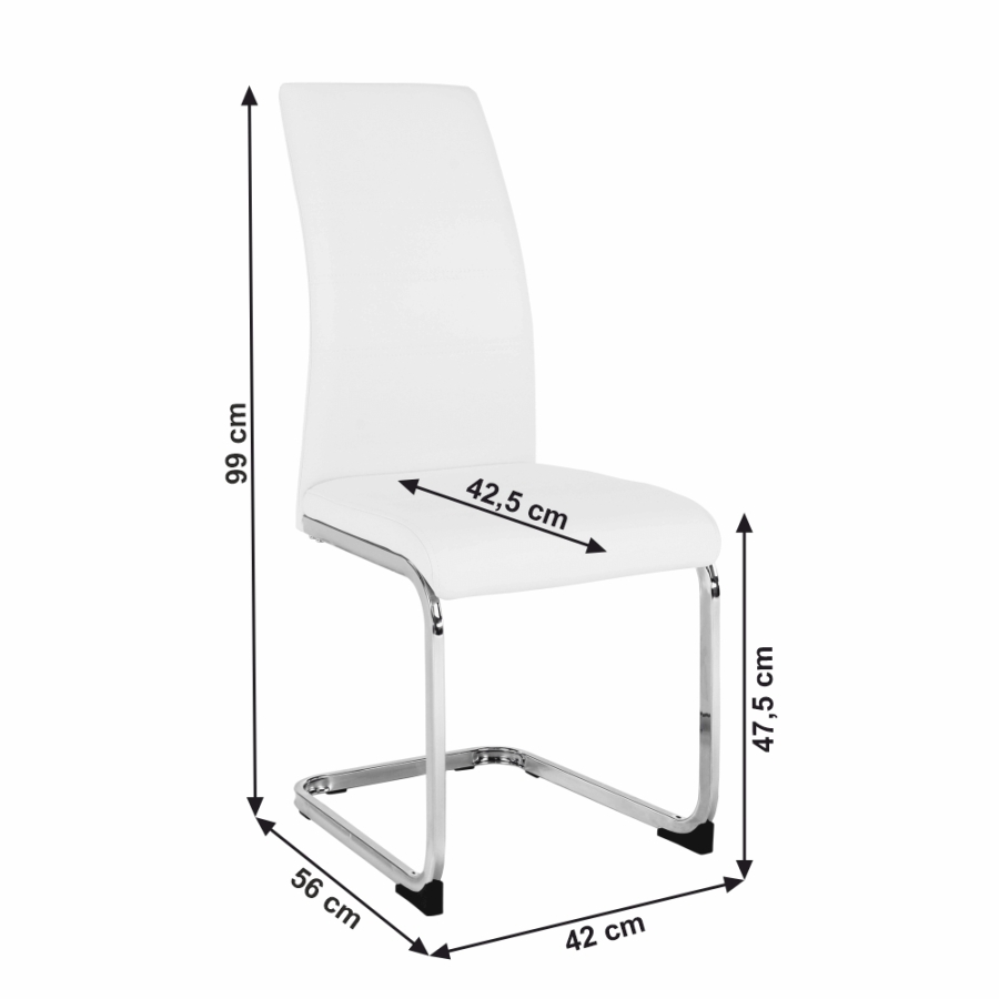 Kárpitozás anyaga: ekobőr A szövet kopásállósága: 100 000 Martindale Kárpitozás színe: fehér Láb anyaga: króm Láb színe: króm Méretek (SzxVxH): 42x56x99 cm Ülés magassága: 47,5 cm Ülés mélysége: 42,5 cm Teherbírás: 90 kg Bontásban szállítva