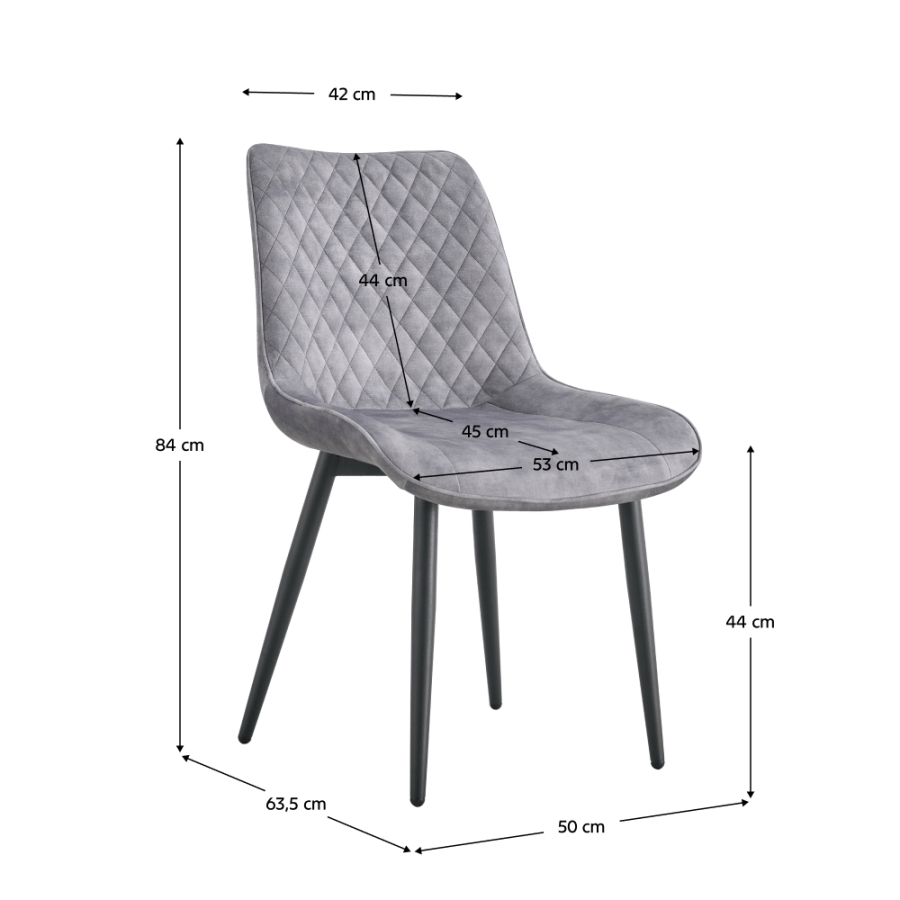 Kárpitozás anyaga: bársonyos szövet A szövet kopásállósága a Martindale teszt szerint: 80 000 ciklus Szín: világosszürke Lábak anyaga: fém Szín: fekete Méretek (SzxMéxMa): 53x60x84 cm Ülés magassága: 46 cm Ülés mélysége: 43,5 cm Ülés szélessége: 53 cm Háttámla szélessége: 42 cm Háttámla magassága: 42 cm Teherbírás: 110 kg Dekoratív varrás Stílusos Szétszerelve szállítva