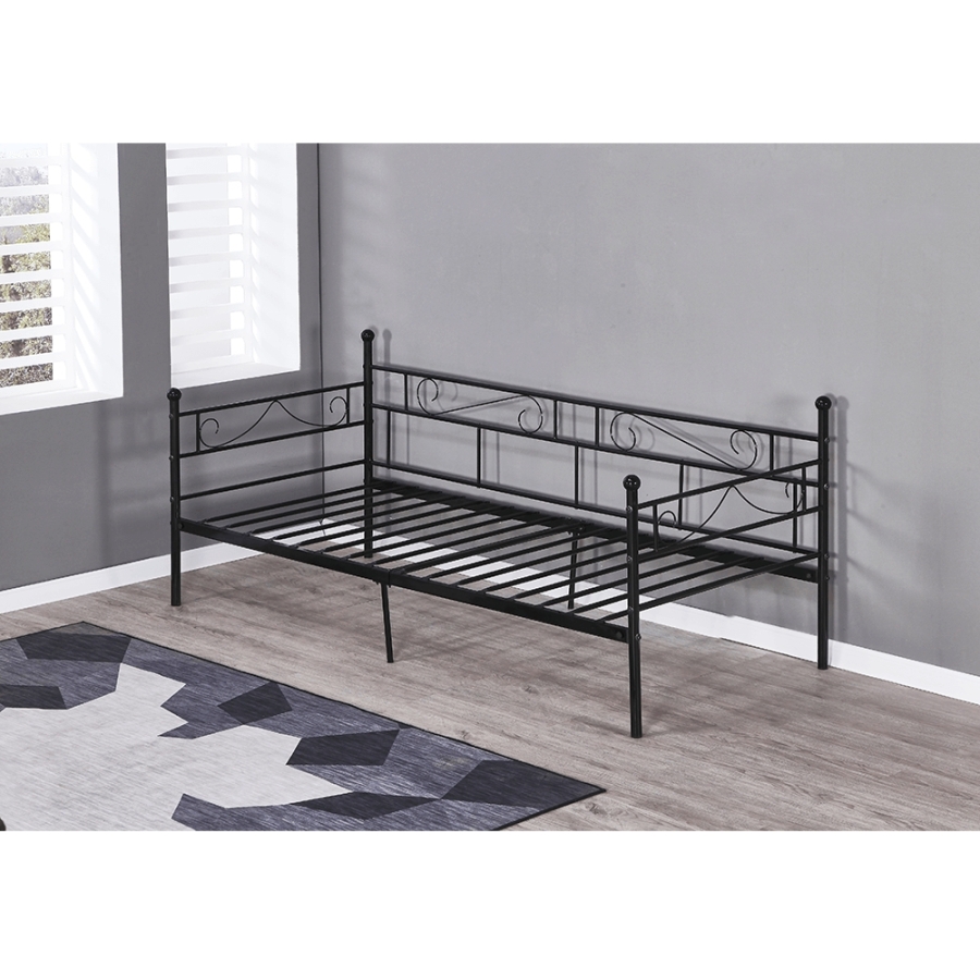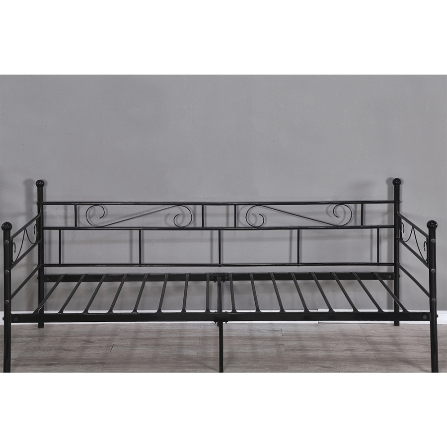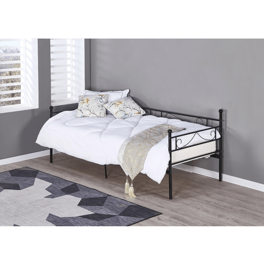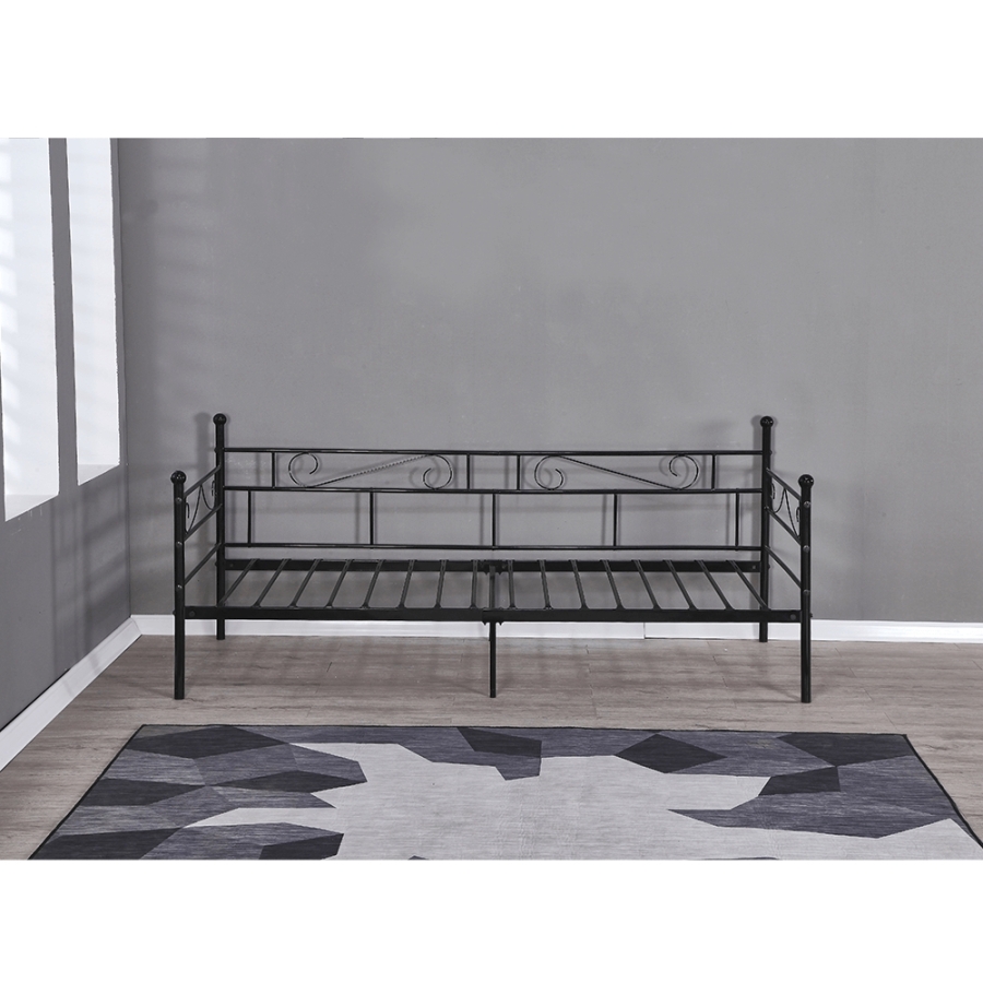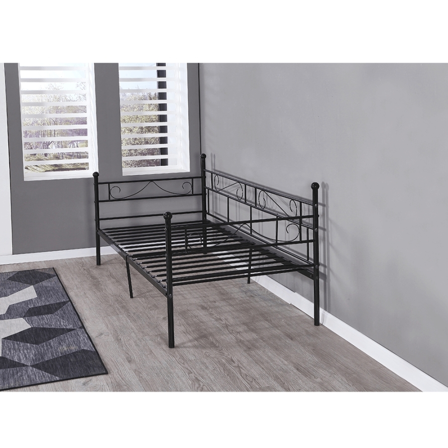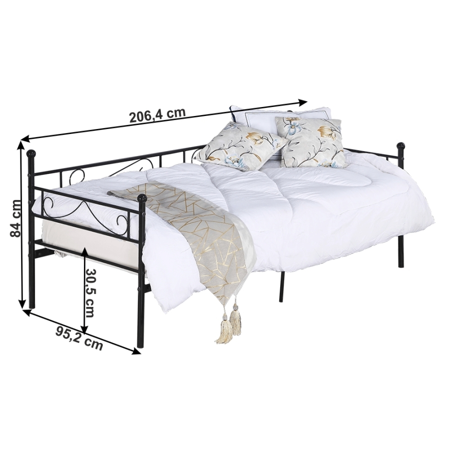 Fém ágy, fém ágyráccsal, ROZALI Anyag: fém Szín: fekete Ágy külső méretei (SzéxMéxMa): 206,4x95,2x84 cm Fekvőfelület: 90x200 cm Magasság az ágyrácsig: 30,5 cm Terhelhetőség: 100 kg Ágyráccsal szállítva Matrac nélkül Vásárolható hozzá matrac 90x200 cm méretben Bontásban szállítva.