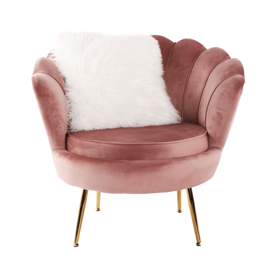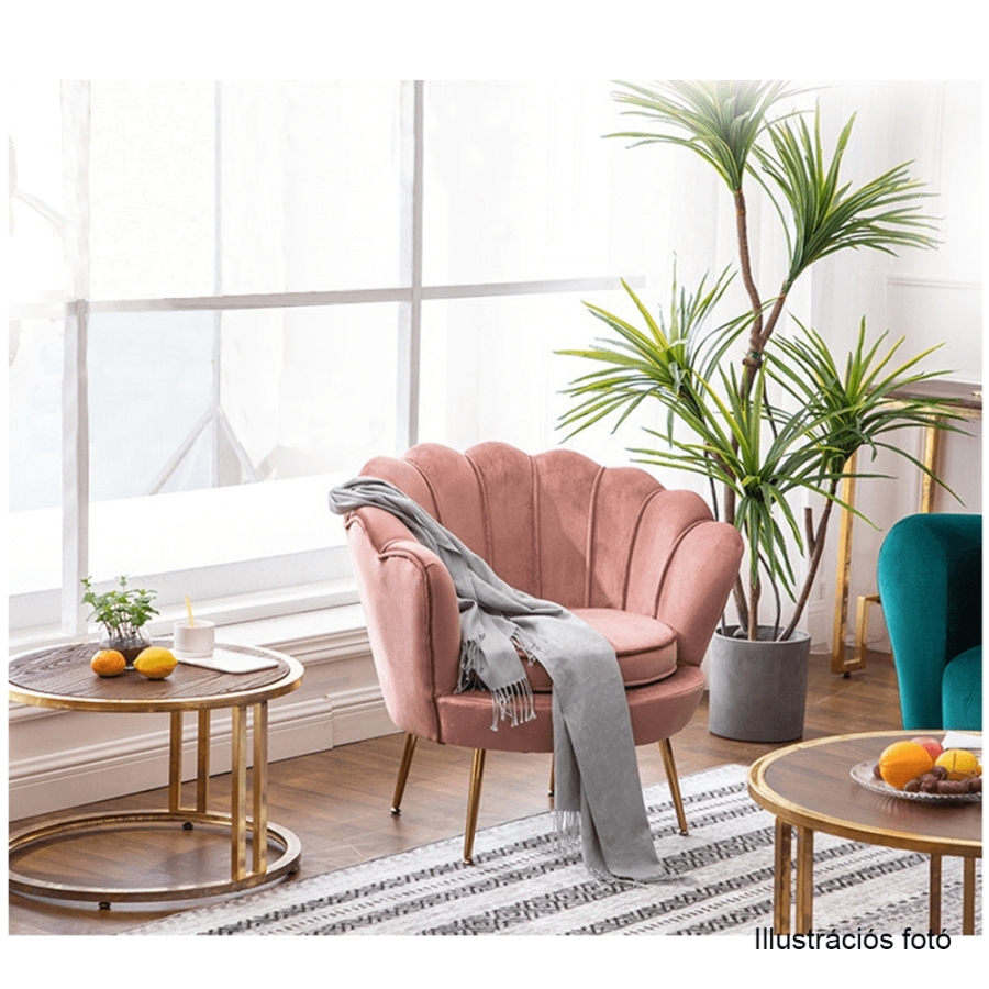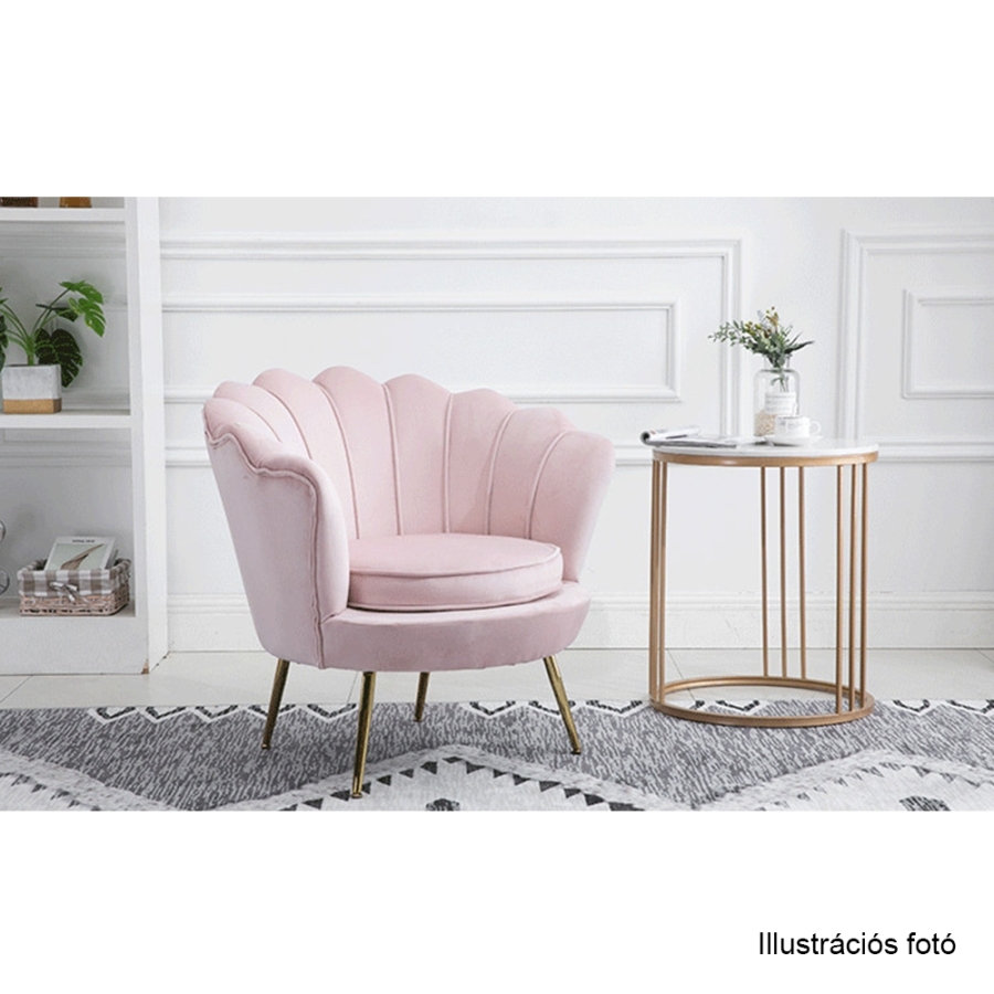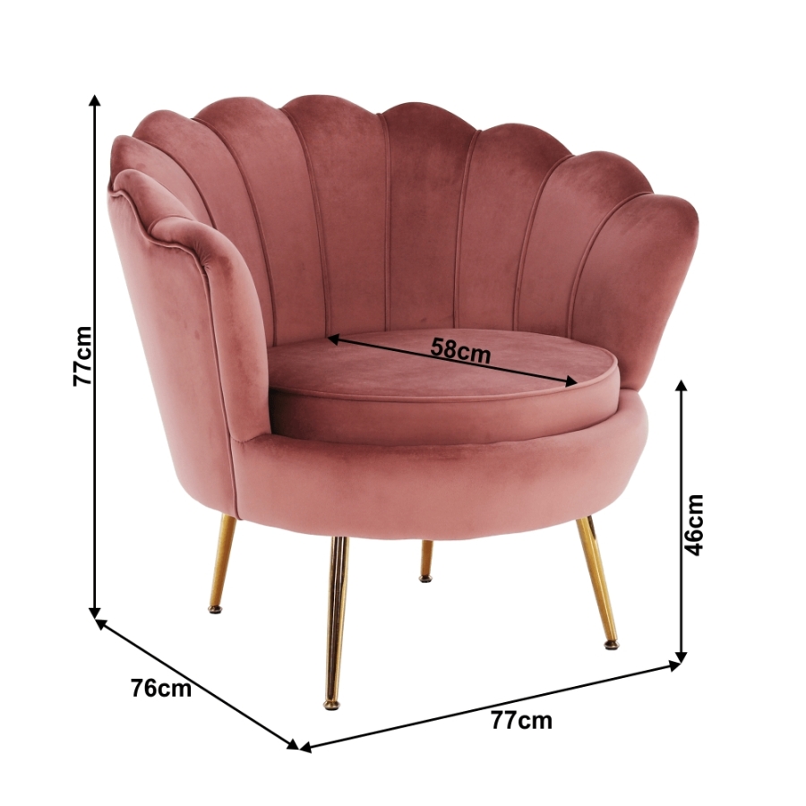 Ülőlap anyaga: Velvet szövet A szövet kopásállósága: 80 000 Martindale Szín: rózsaszín 23 Lábak anyaga: fém Szín: gold króm-arany Méretei (SzéxMéxMa): 77x76x77 cm Ülés magassága: 44 cm Ülés mélysége: 56 cm Teherbírás: 90 kg Dizájnos Art-deco stílus Kagyló alak Modern kidolgozás Bontásban szállítva.