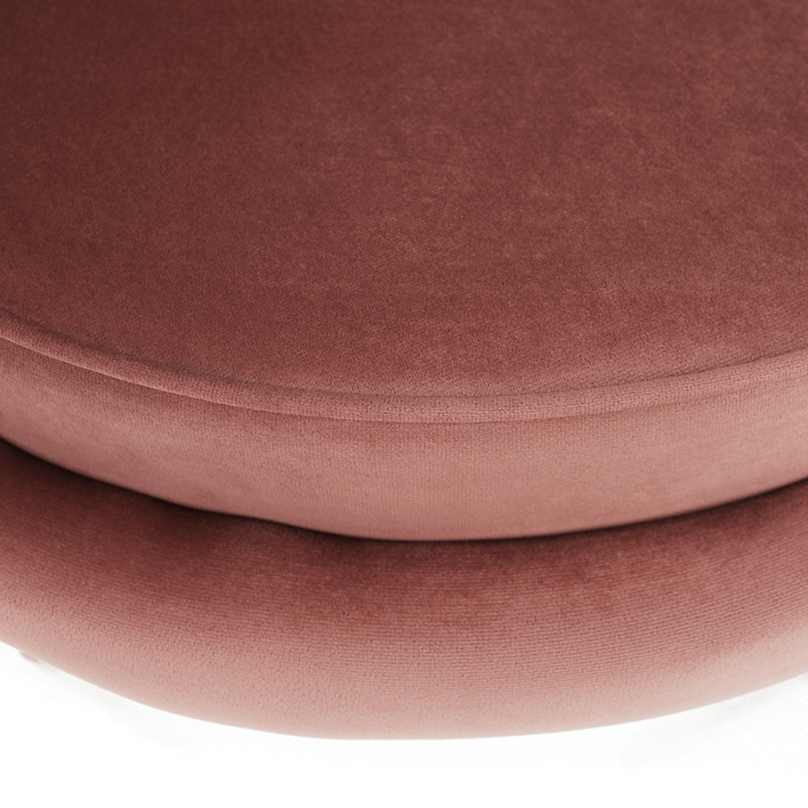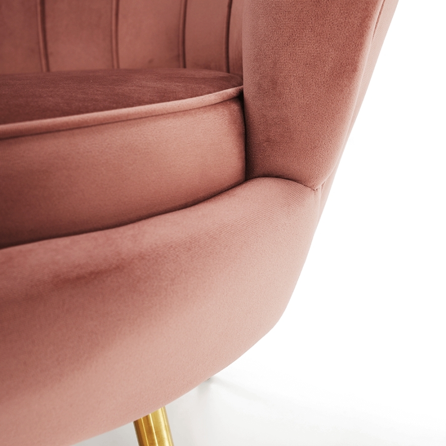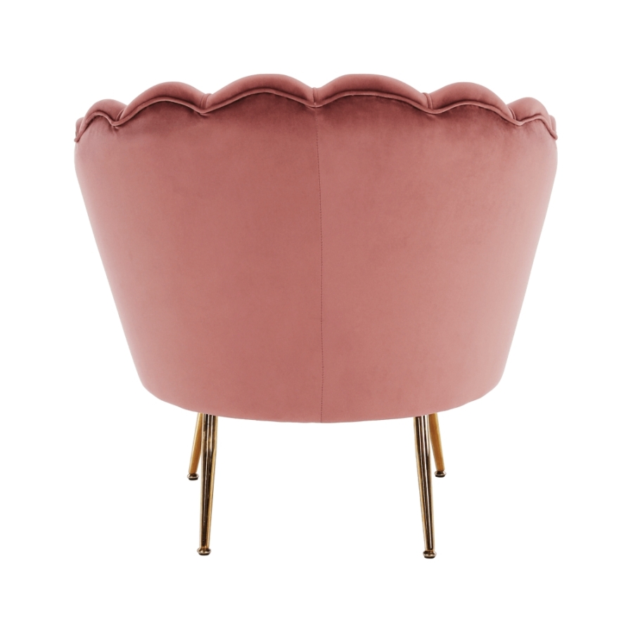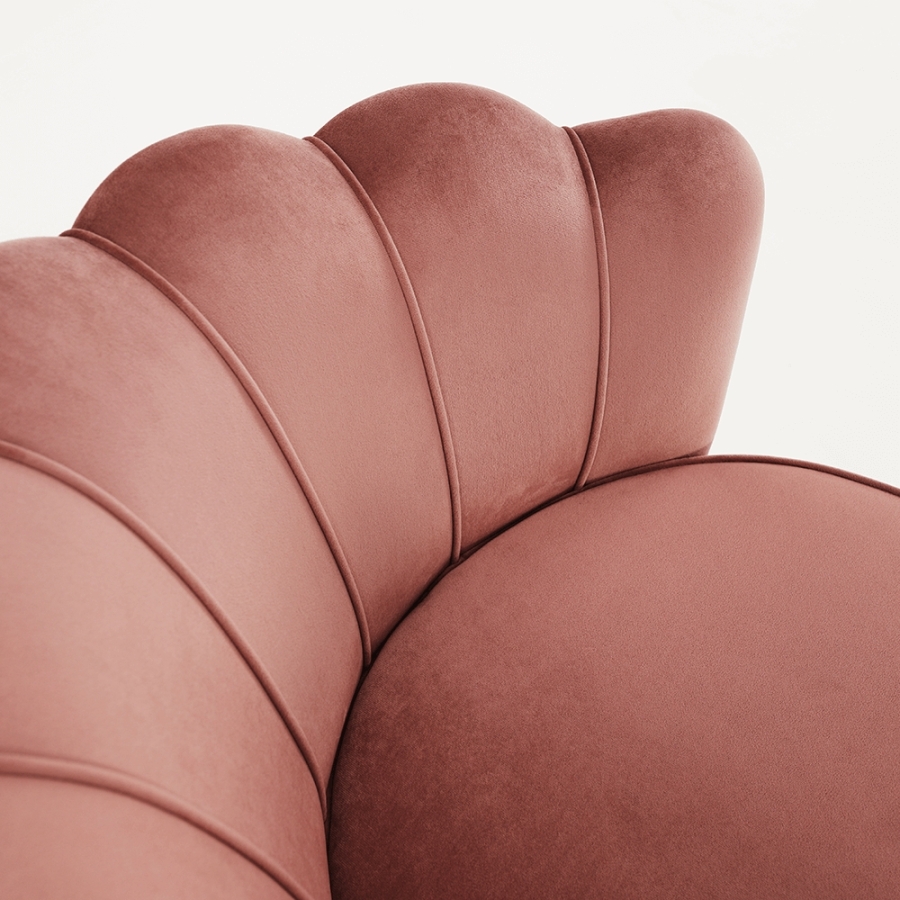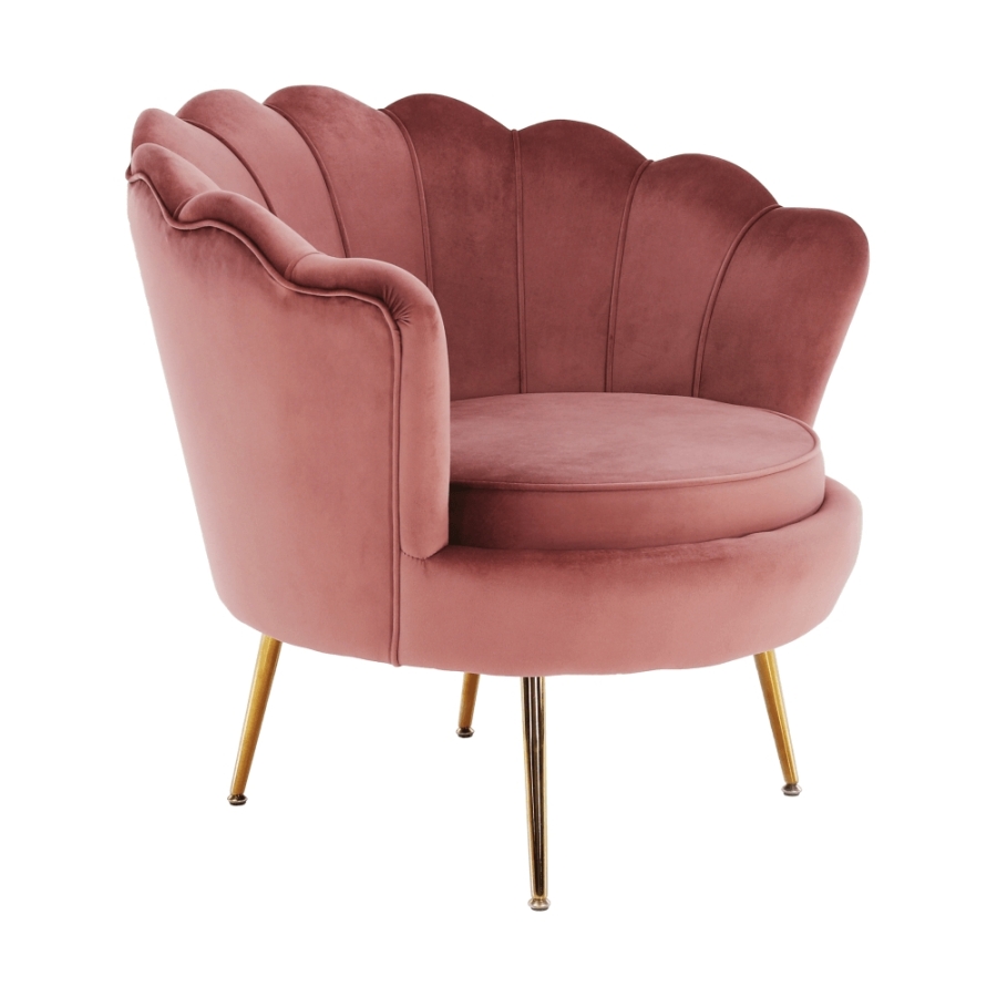 Ülőlap anyaga: Velvet szövet A szövet kopásállósága: 80 000 Martindale Szín: rózsaszín 23 Lábak anyaga: fém Szín: gold króm-arany Méretei (SzéxMéxMa): 77x76x77 cm Ülés magassága: 44 cm Ülés mélysége: 56 cm Teherbírás: 90 kg Dizájnos Art-deco stílus Kagyló alak Modern kidolgozás Bontásban szállítva.