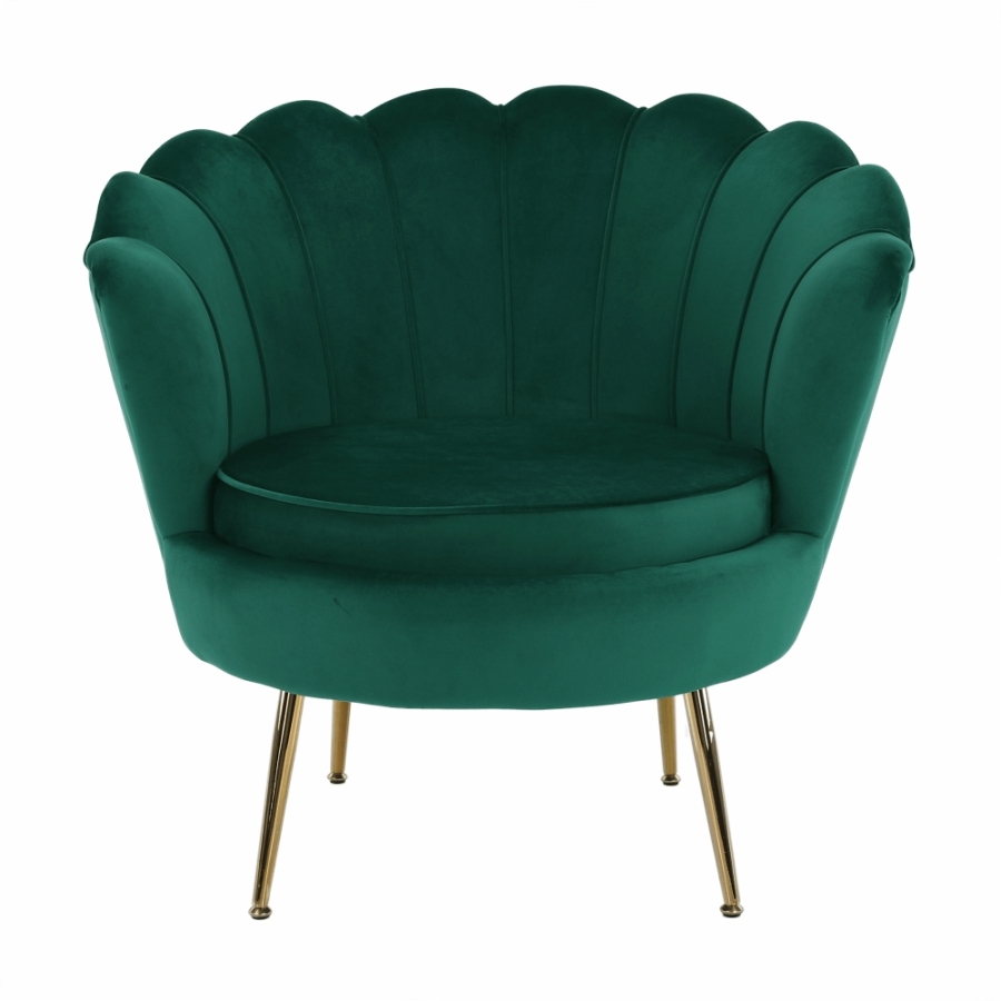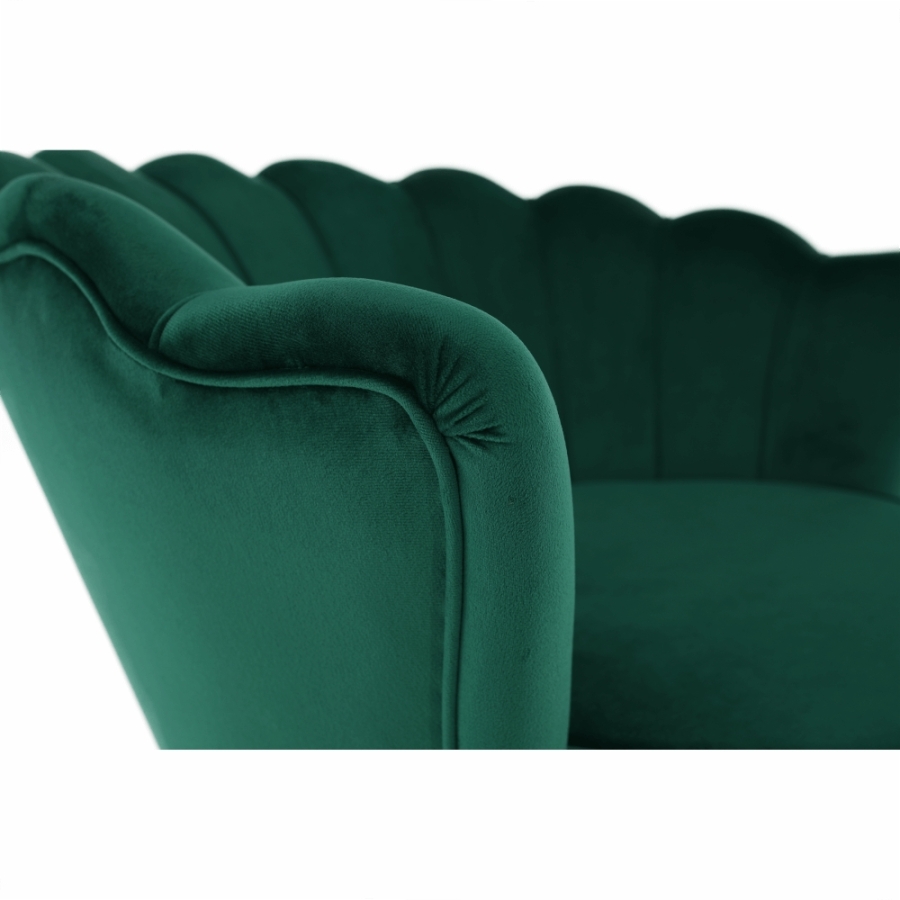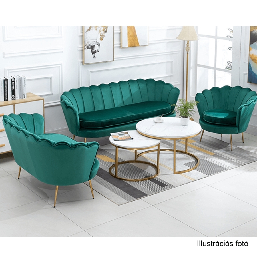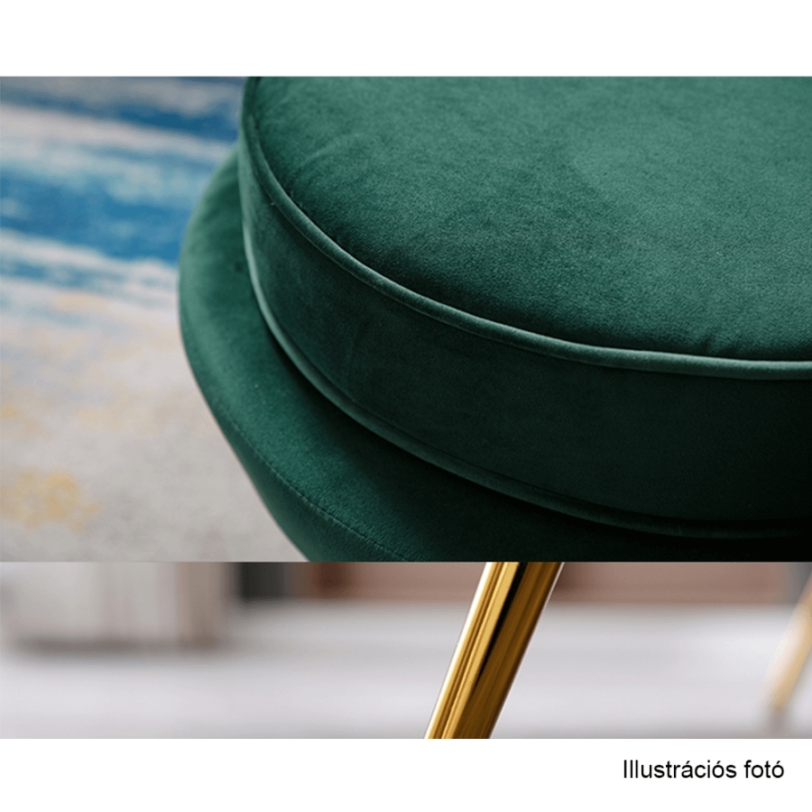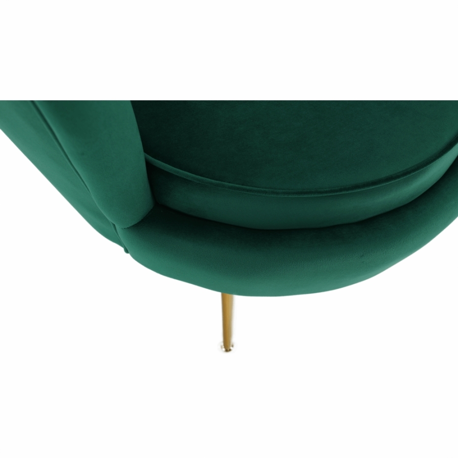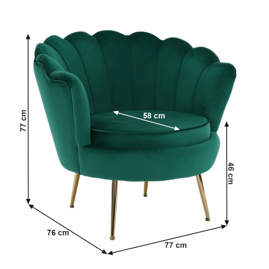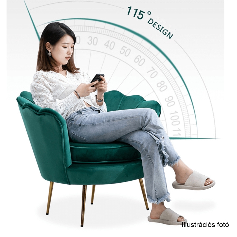 Ülőlap anyaga: Velvet szövet A szövet kopásállósága: 80 000 Martindale Szín: smaragd 18 Lábak anyaga: fém Szín: gold króm-arany Méretei (SzéxMéxMa): 77x76x77 cm Ülés mélysége: 56 cm Ülés magassága: 44 cm Teherbírás: 90 kg Dizájnos Art-deco stílus Kagyló alak Modern kidolgozás Bontásban szállítva.