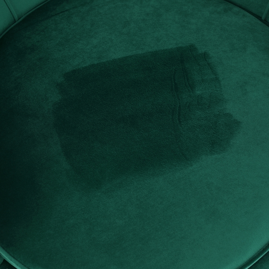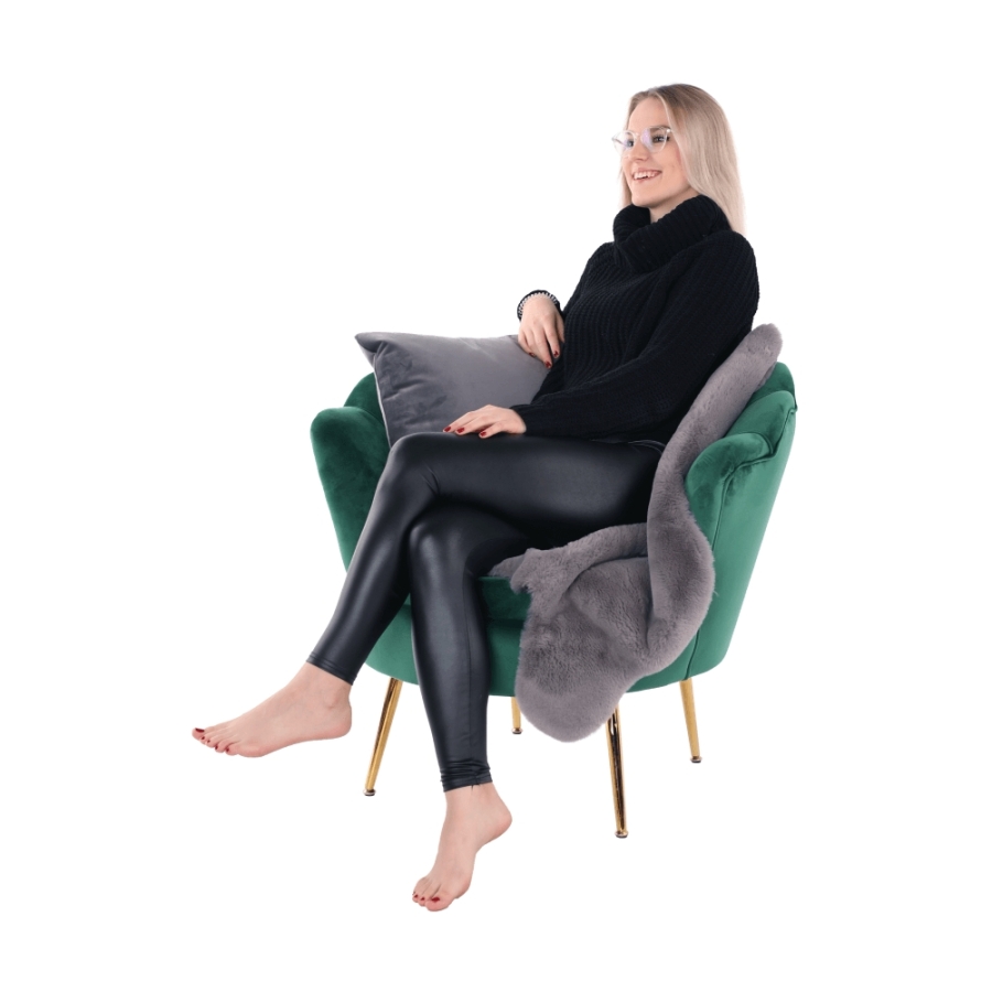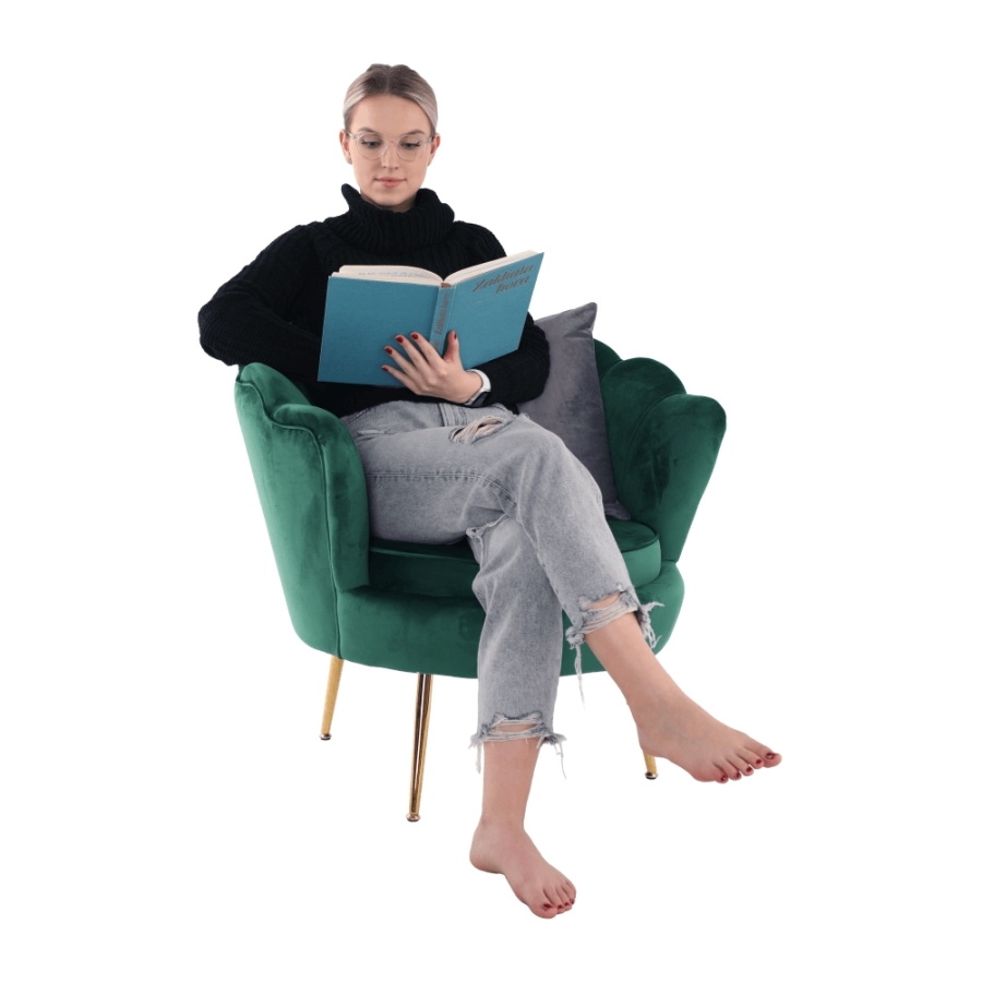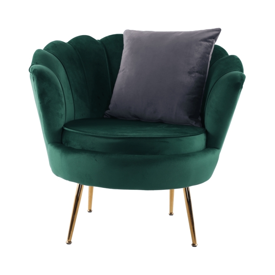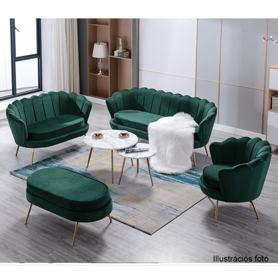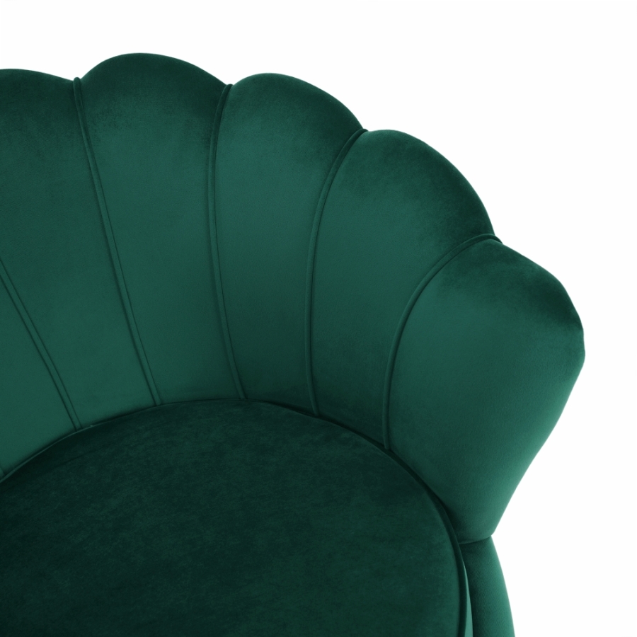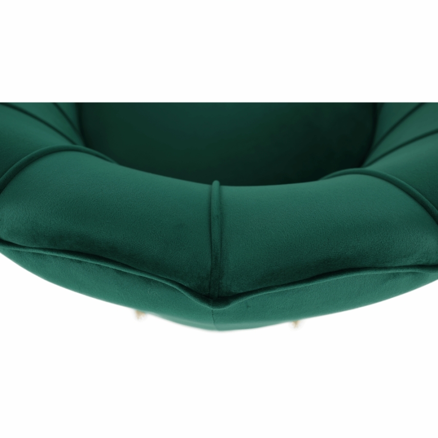 Ülőlap anyaga: Velvet szövet A szövet kopásállósága: 80 000 Martindale Szín: smaragd 18 Lábak anyaga: fém Szín: gold króm-arany Méretei (SzéxMéxMa): 77x76x77 cm Ülés mélysége: 56 cm Ülés magassága: 44 cm Teherbírás: 90 kg Dizájnos Art-deco stílus Kagyló alak Modern kidolgozás Bontásban szállítva.
