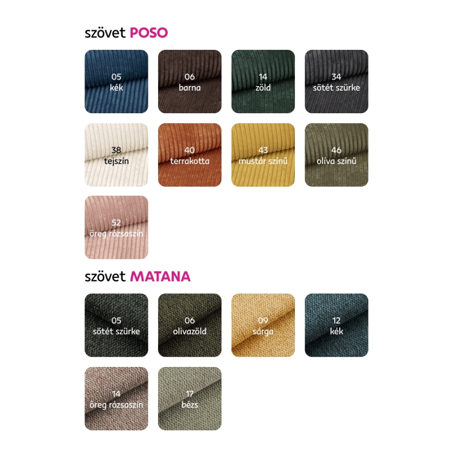 Megrendelhető a Poso szövet 9 színváltozatában és a Matana szövet 6 színváltozatában, fekete vagy bükkfa választási lehetőséggel ár: 69 900 Ft. Egyedi megrendelés esetén a megadott összeg 10%-át előlegként szükséges befizetni. Az előleg befizetése után kérése a gyártásba kerül. Szállítási idő 6-8 hét.