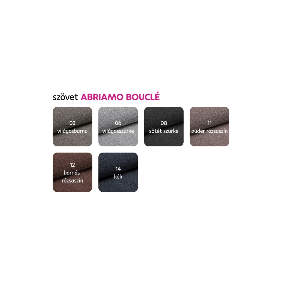 Az Abriamo Bouclé szövet 6 színváltozatában megrendelhető, ár: 92.900 Ft. Egyedi megrendelés esetén a megadott összeg 10%-át előlegként szükséges befizetni. Az előleg befizetése után kérése a gyártásba kerül. Szállítási idő 6-8 hét.