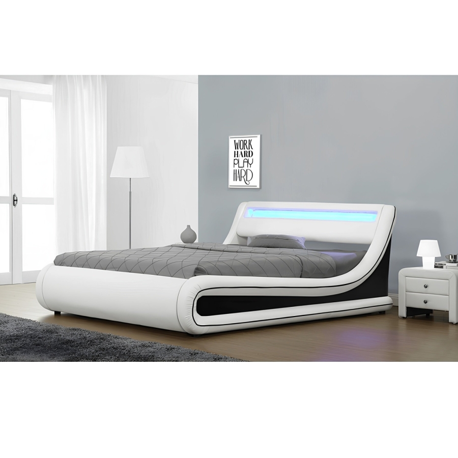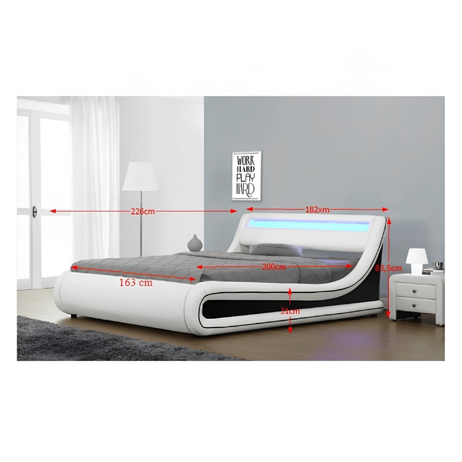 Modern franciaágy MANILA NEW tárolóhellyel, lamella ágyráccsal és RGB LED világítással a háttámlában Anyag: textilbőr A szövet kopásállósága: 100 000 Martindale Színe: fehér/fekete Méretek (SzéxMéxMa): 182x226x83,5 cm Fekvőfelület (SzéxH): 163x200 cm Magasság az ágyrácsig: 31 cm Rendelhető hozzá matrac 163x200 cm-es méretben. Lapraszerelten szállítva