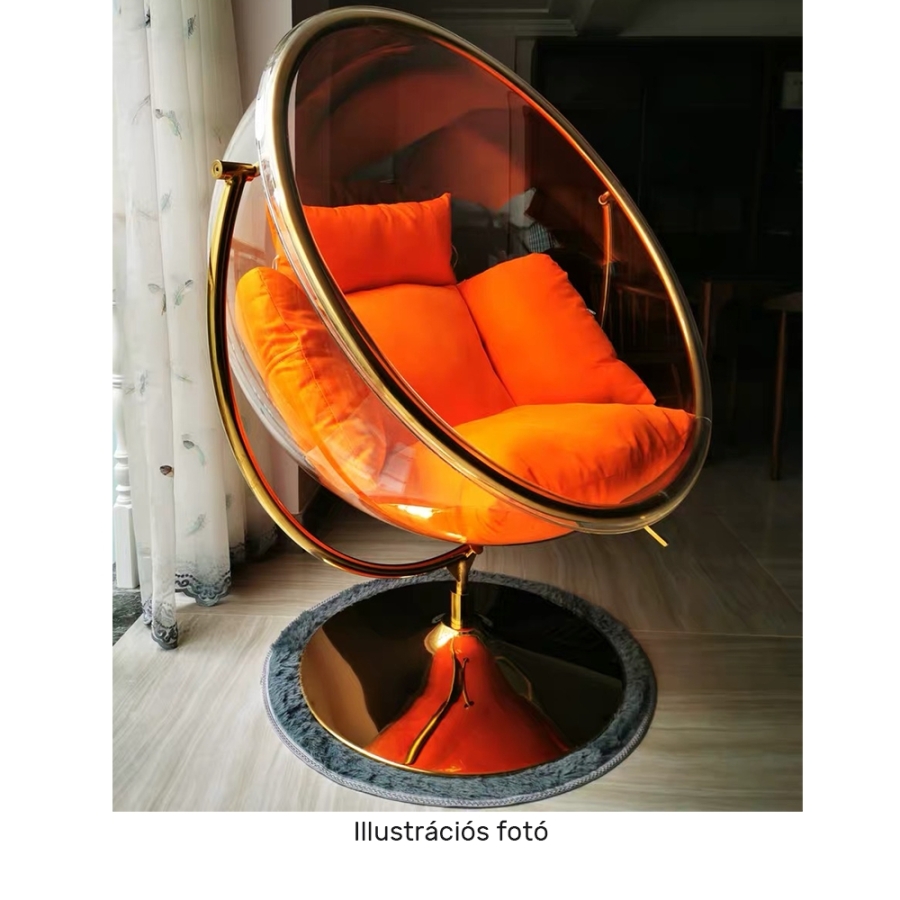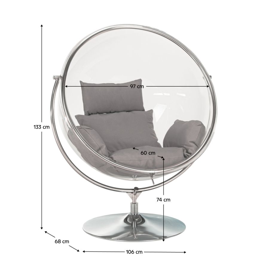 Függő fotel állvánnyal BUBBLE NEW TYP 2 Anyag: rozsdamentes acél/ akril/szövet Szövet kopásállósága a Martindale teszt szerint: 95 000 ciklus Keret színe: ezüst Akril színe: átlátszó Párna színe: szürke Fotel méretei (SzxMéxMa): 106x68x133 cm Belső átmérő: 97 cm Ülés mélysége: 60 cm