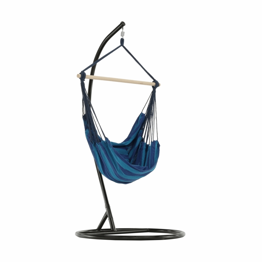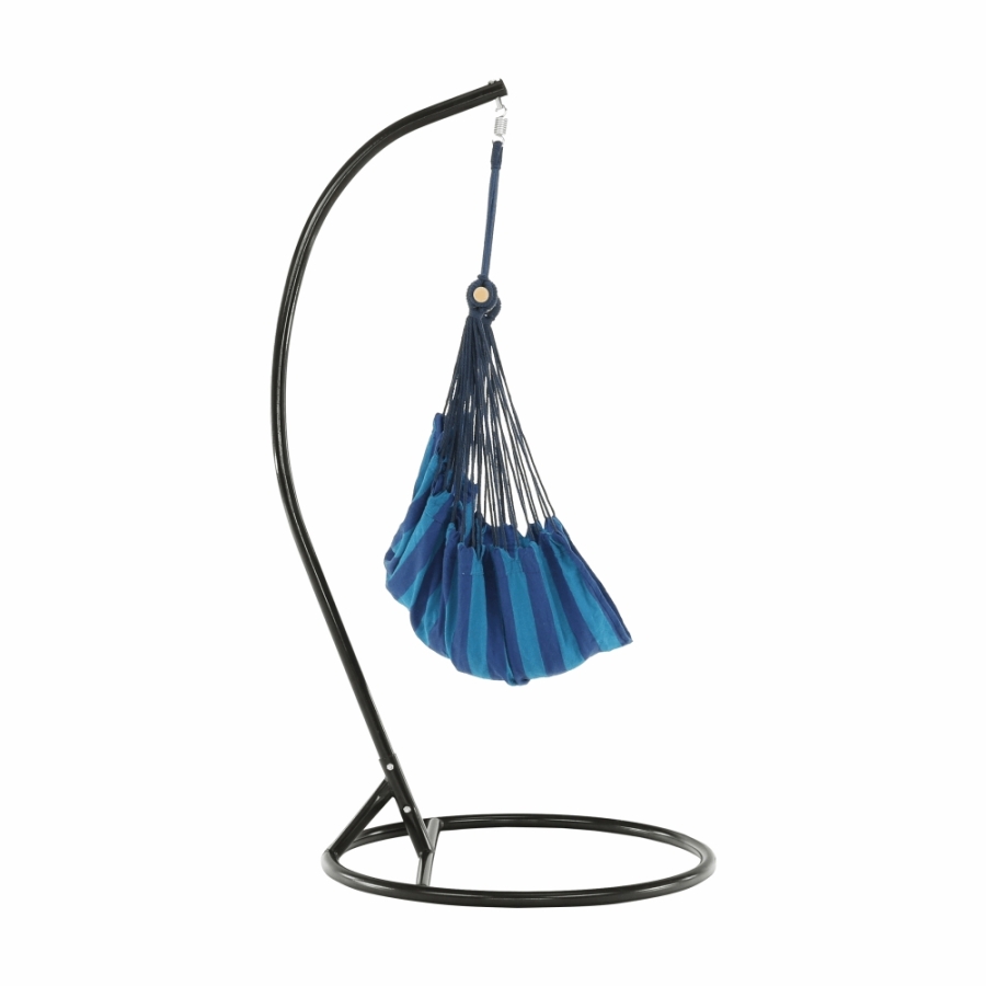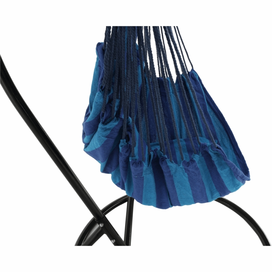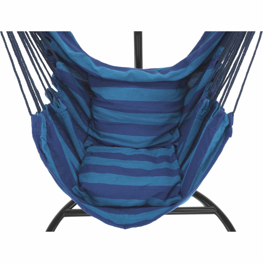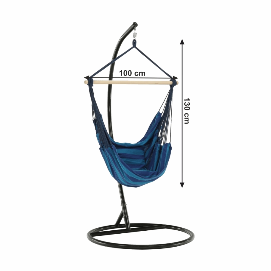 Függő hintafotel NIKOLO NEW Anyag: pamut/poliészter/fa Szín: kék Méretek (SzéxMéxMa): 100x100x130 cm Terhelhetőség: 120 kg Speciális varrat Farúddal Két párnával Alkalmas kültérre és beltérbe egyaránt Állvány nélkül szállítjuk Az állvány nem része a csomagnak, megrendelhető Szállítás szétszerelve