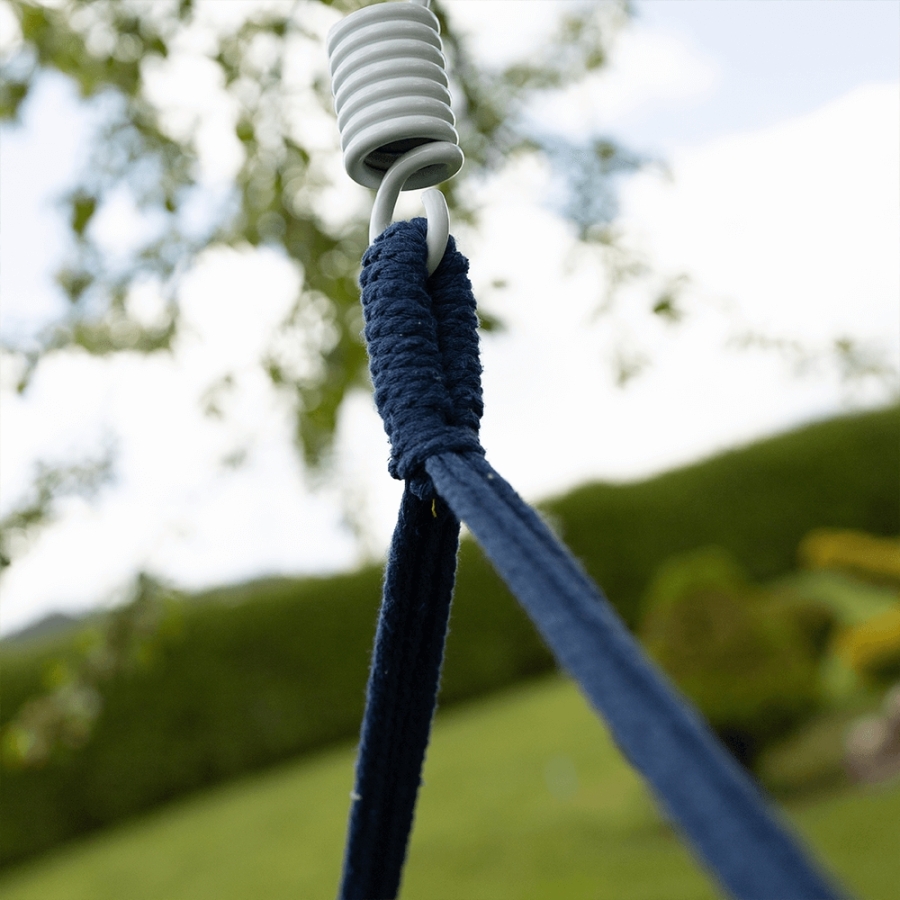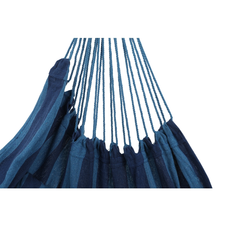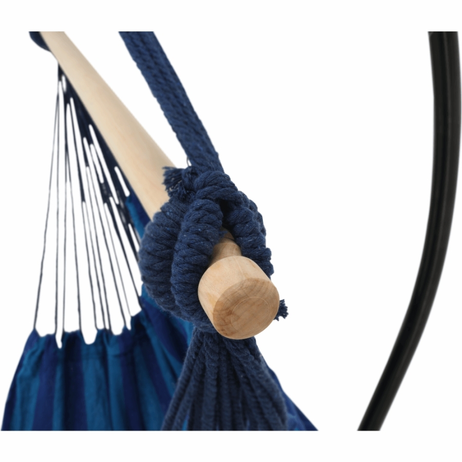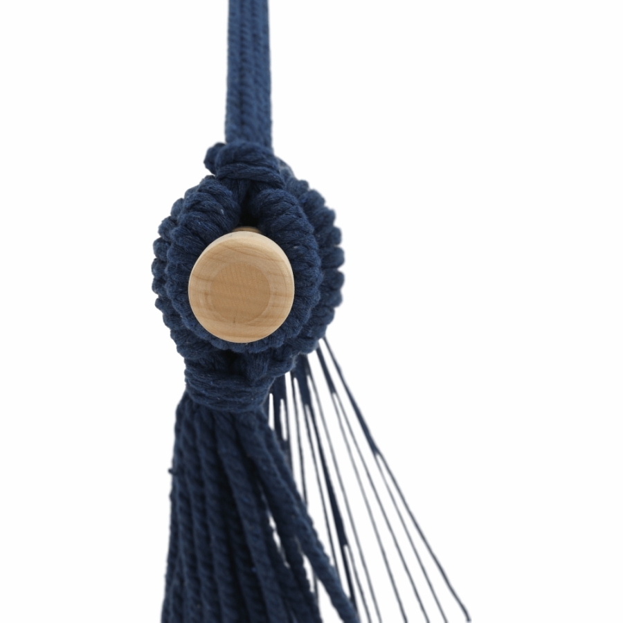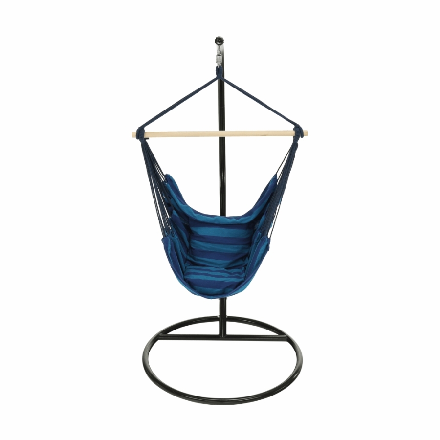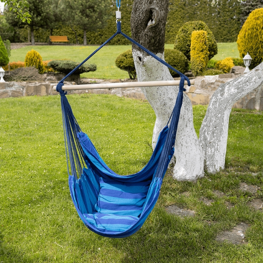 Függő hintafotel NIKOLO NEW Anyag: pamut/poliészter/fa Szín: kék Méretek (SzéxMéxMa): 100x100x130 cm Terhelhetőség: 120 kg Speciális varrat Farúddal Két párnával Alkalmas kültérre és beltérbe egyaránt Állvány nélkül szállítjuk Az állvány nem része a csomagnak, megrendelhető Szállítás szétszerelve