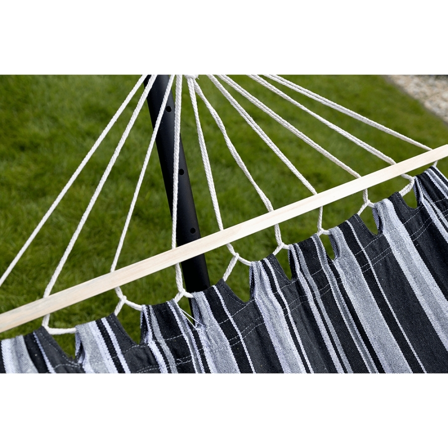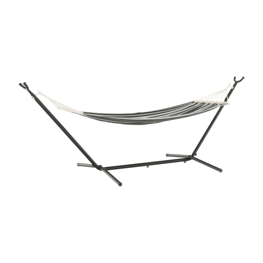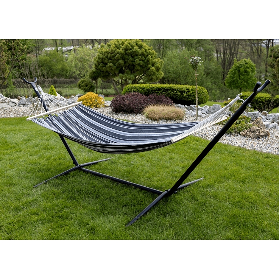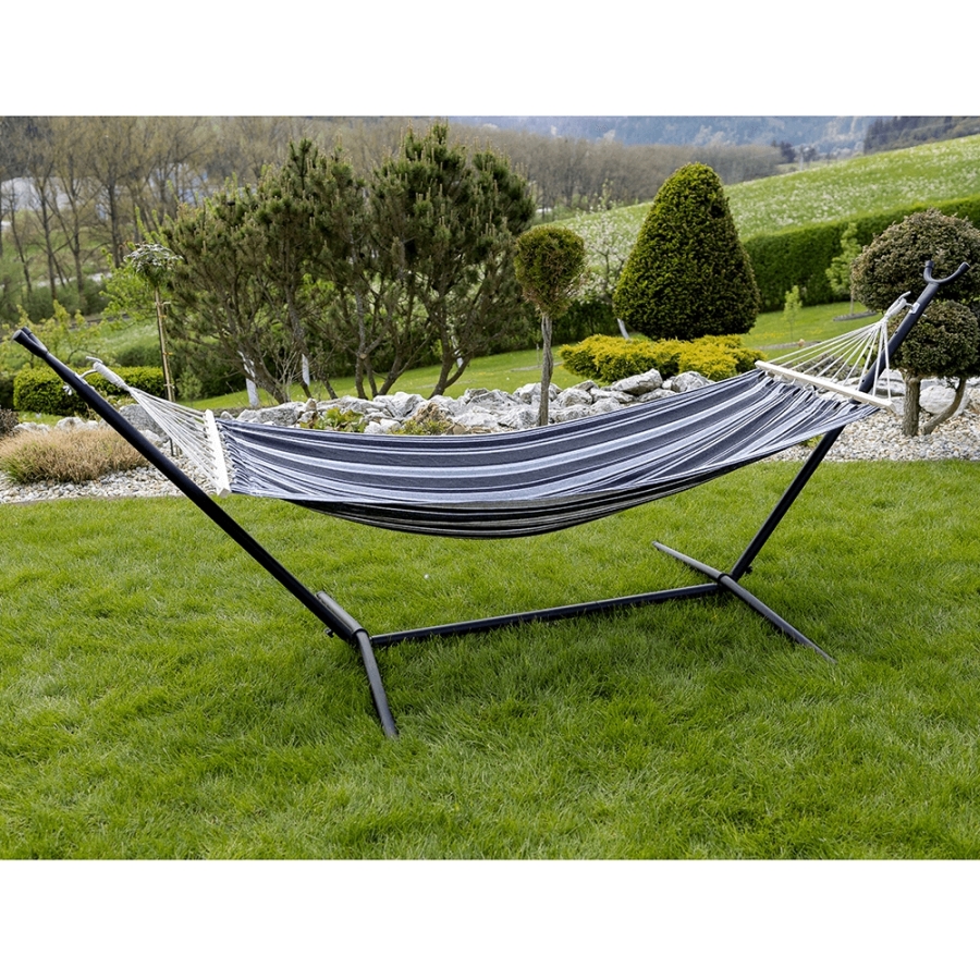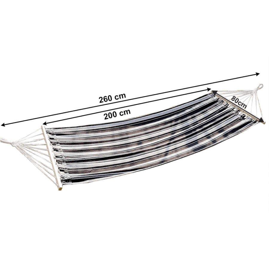 Függőágy EVANA NEW Anyag: 50% pamut/50% poliészter/fa Színe: szürke/fehér Fekvőfelület (SzéxHo): 80x200cm Teljes hossz: 260cm Terhelhetőség: 120 kg Alkalmas 1 személy számára Alkalmas kültérre és beltérbe egyaránt Állvány nélkül szállítjuk Az állvány nem része a csomagnak, megrendelhető Szállítás: szétszerelve Mosási hőmérséklet 60° Ne fehérítse Közepes hőmérsékleten vasalja Árnyékban szárítás Vegyszerrel ne tisztítsa