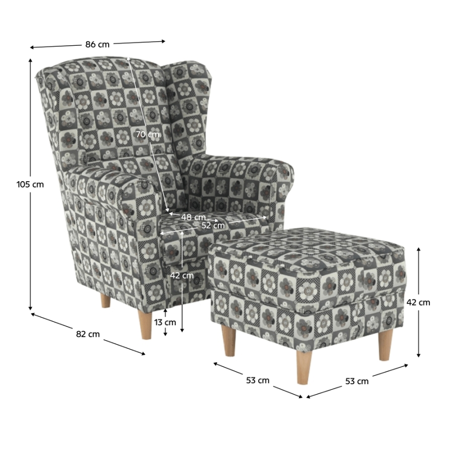 Méretek (SzéxMéxMa): fotel - 86x72x105 cm, puff - 53x53x42 cm