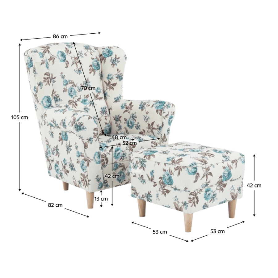 Méretek (SzéxMaxMé): fotel - 86x105x72 cm, puff - 53x42x53 cm,