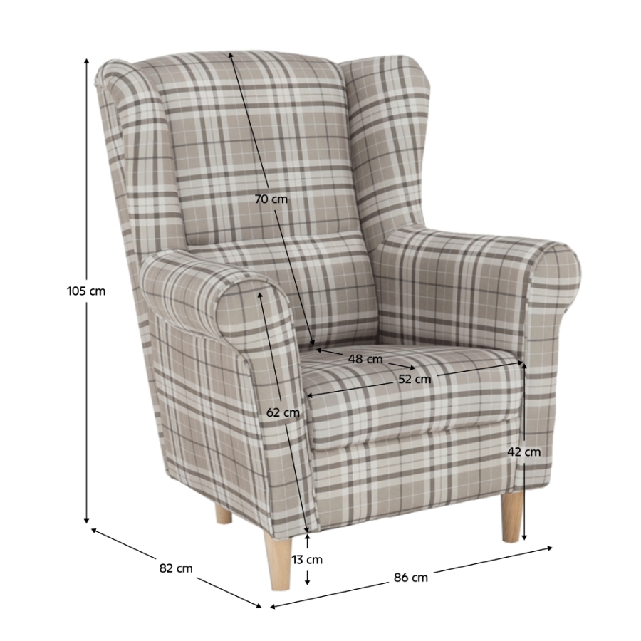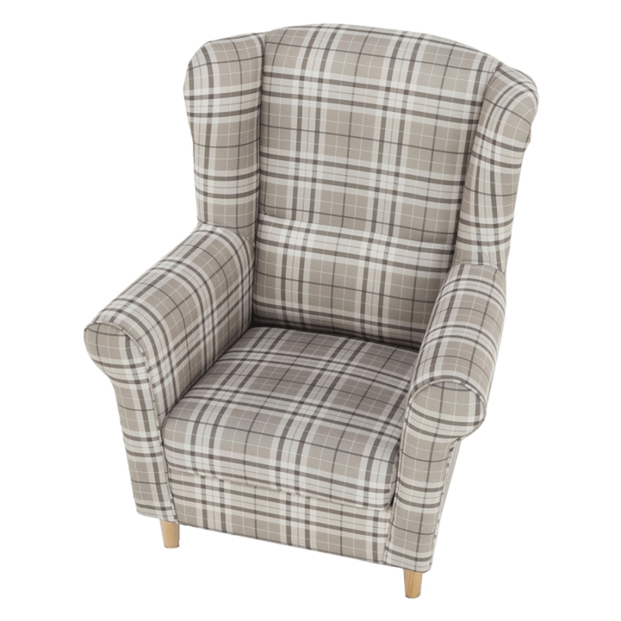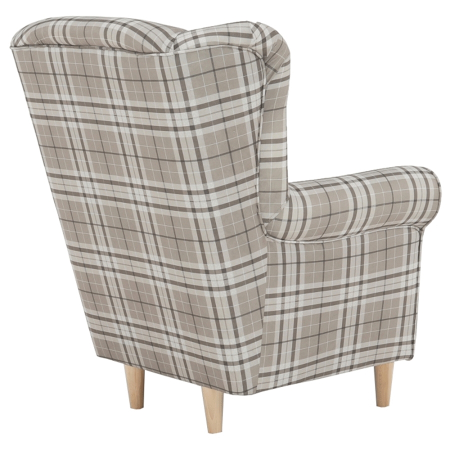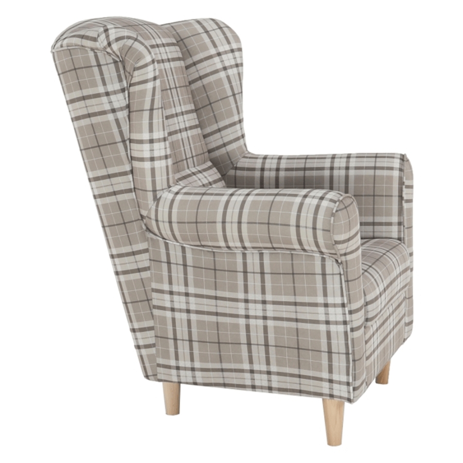 Füles fotel CHARLOT barna kockás szövet változatban. Falábak bükk színváltozatban.