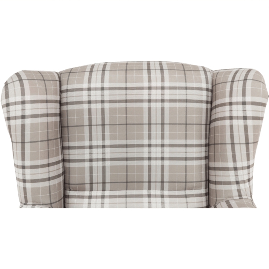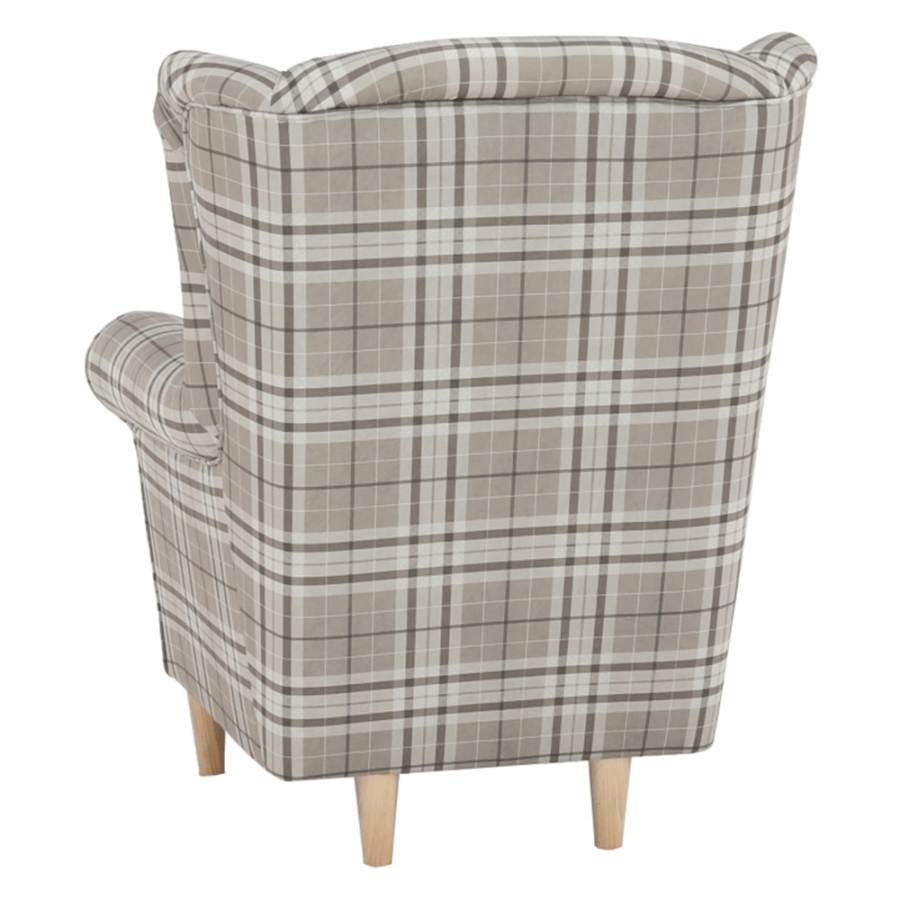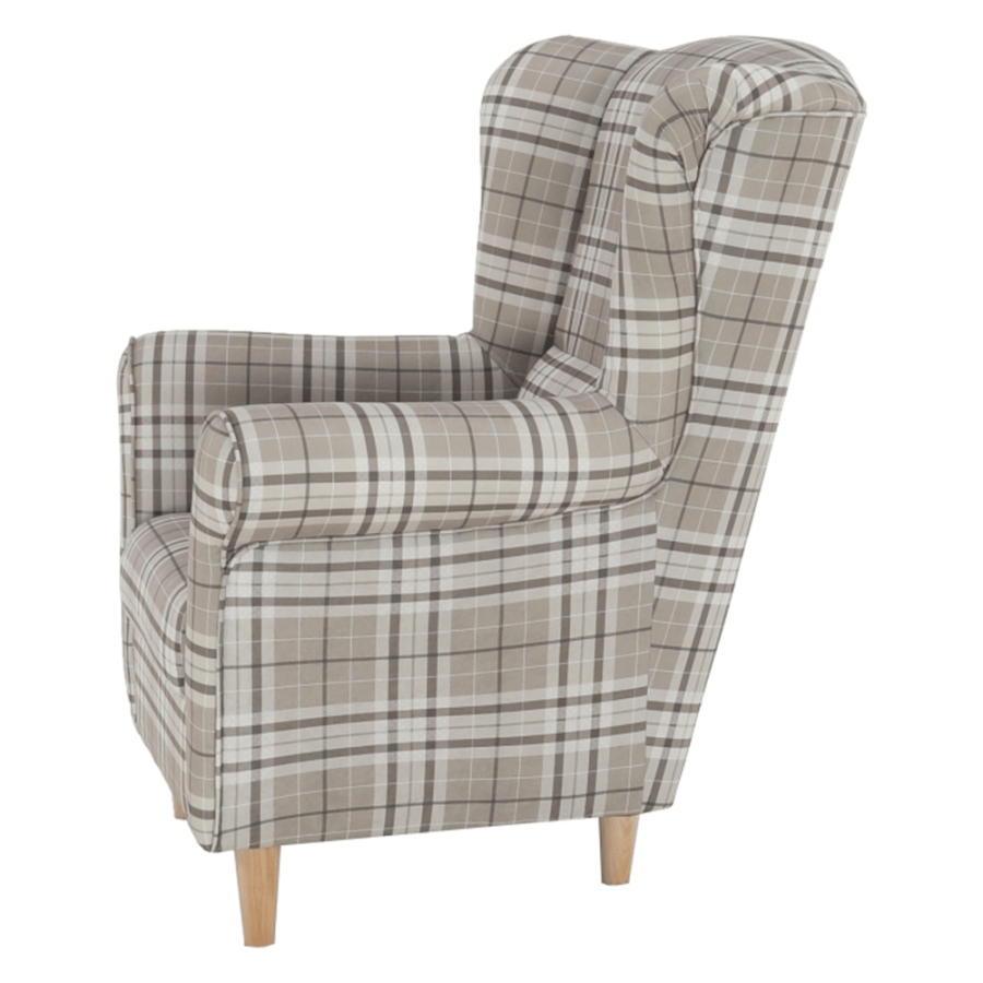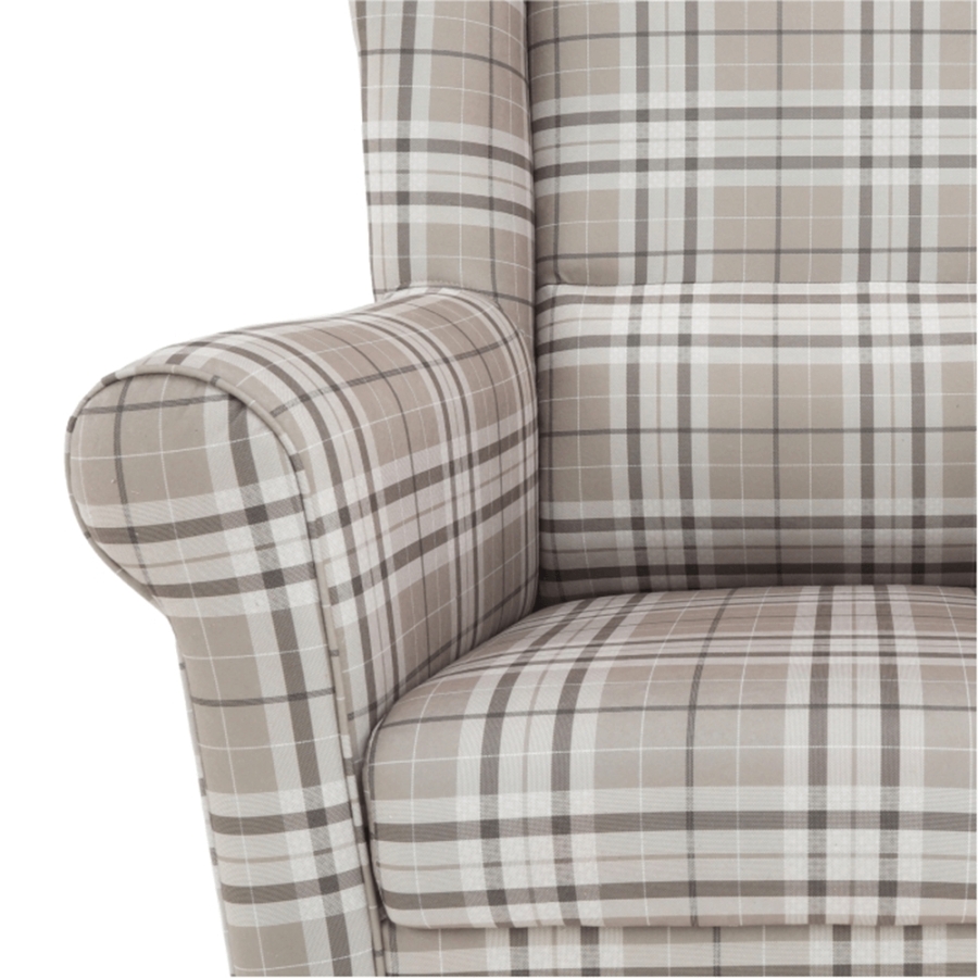 Füles fotel CHARLOT barna kockás szövet változatban. Falábak bükk színváltozatban.