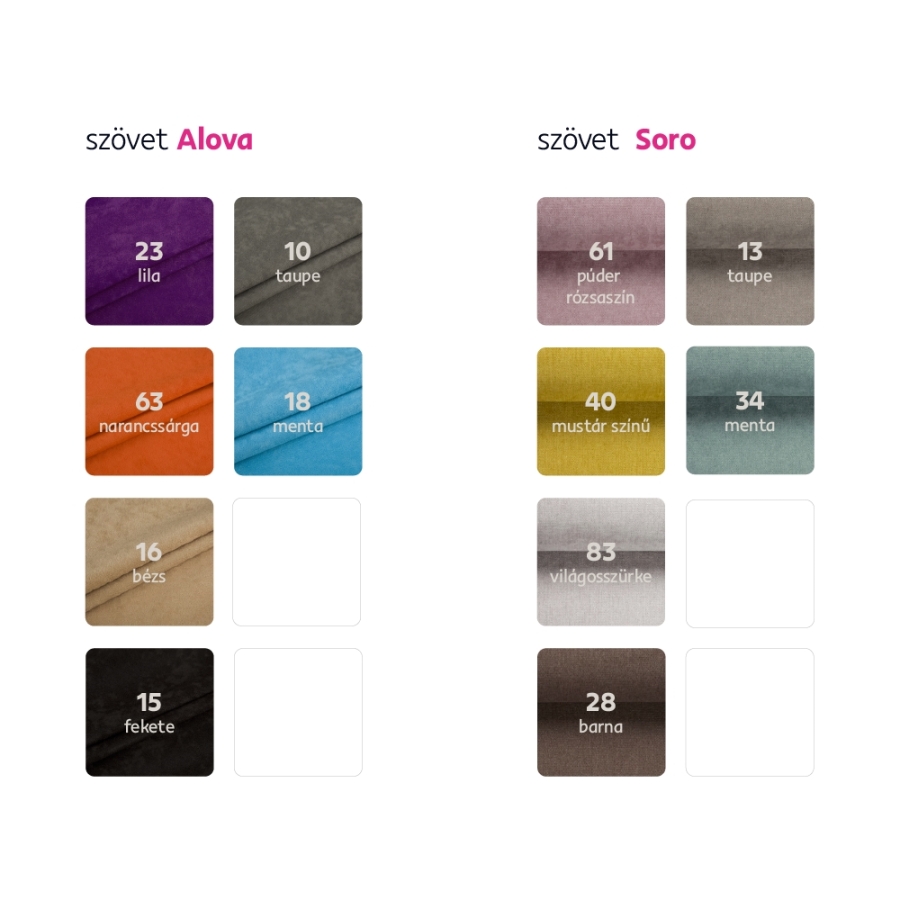 Megrendelhető Charlot Alova szövet színváltozataiban ára 119 900 Ft vagy Soro szövetből ára 129 900 Ft. Egyedi megrendelés esetén szükség van az adott összegnek a 10%-át befizetni,mint előleg. Az előleg befizetése után az Ön követelményét benyújtjuk a gyártónak. Szállítási idő 8-10 hét.
