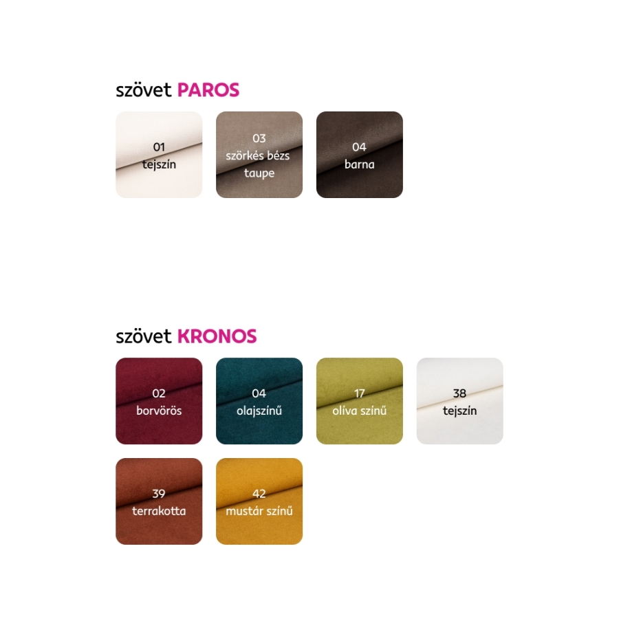 Megrendelhető a Paros szövet 3 színárnyalatában és a Kronos szövet 6 színárnyalatában, fehér, fekete, dió vagy bükk fa választási lehetőséggel ár: 158 900 Ft, 6-8 hét szállítási idővel. Egyedi megrendelés esetén az adott összeg 10%-át előlegként szükséges befizetni. Az előleg befizetése után kérése gyártásba kerül.