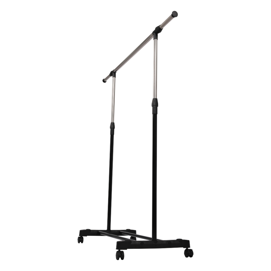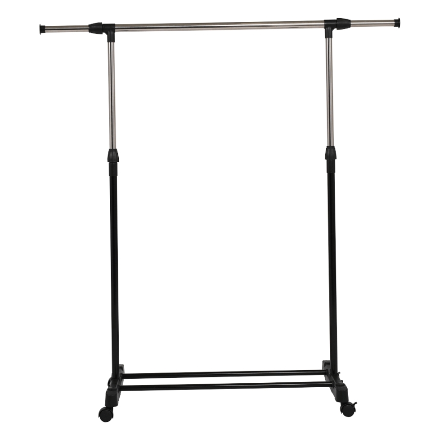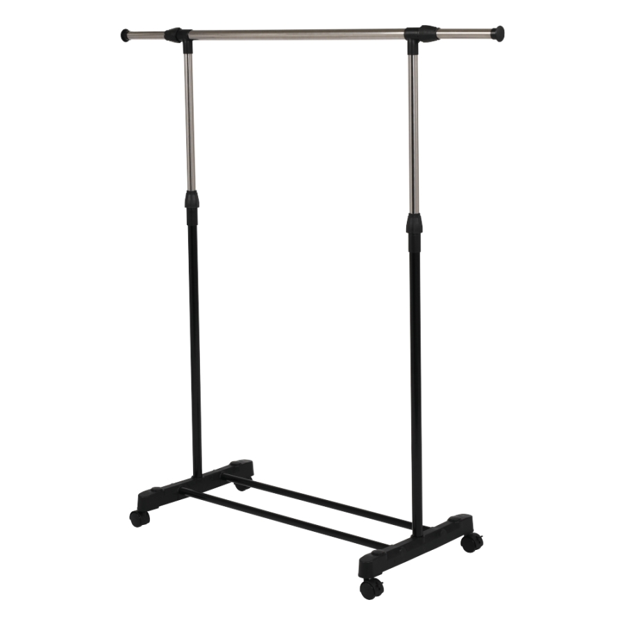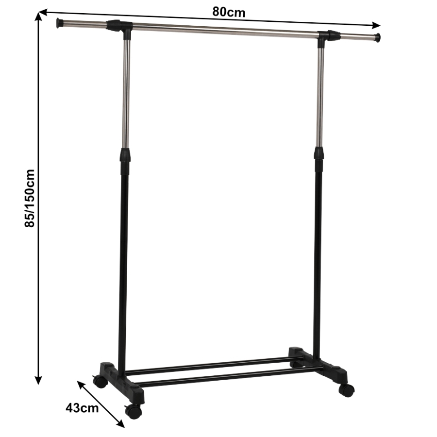 HILAR görgős ruhaállvány állítható magasságú rúddal Anyag: fém/műanyag Színe: fekete Méretek (SzéxMéxMa): 80x43x85-150 cm Terhelhetősség:1,6 kg Szállítás szétszerelve.