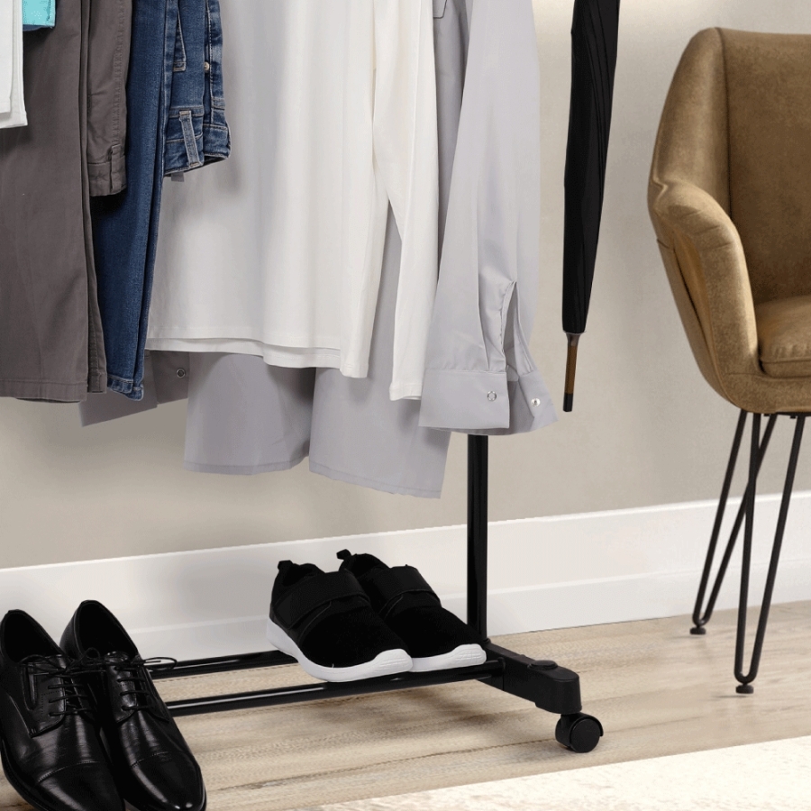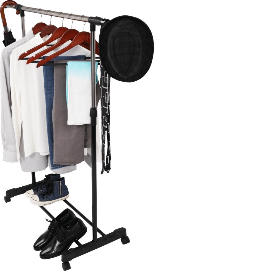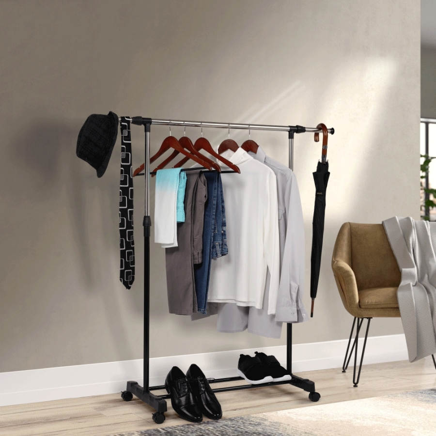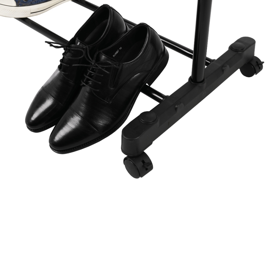 HILAR görgős ruhaállvány állítható magasságú rúddal Anyag: fém/műanyag Színe: fekete Méretek (SzéxMéxMa): 80x43x85-150 cm Terhelhetősség:1,6 kg Szállítás szétszerelve.