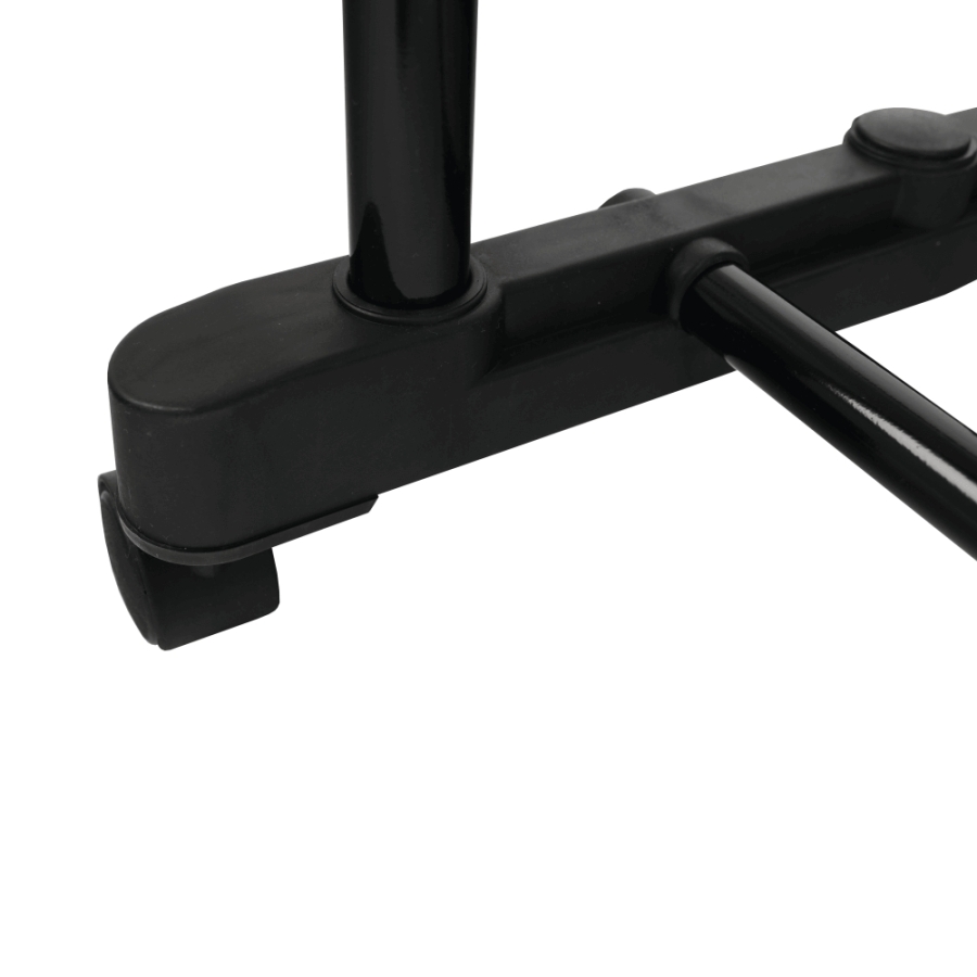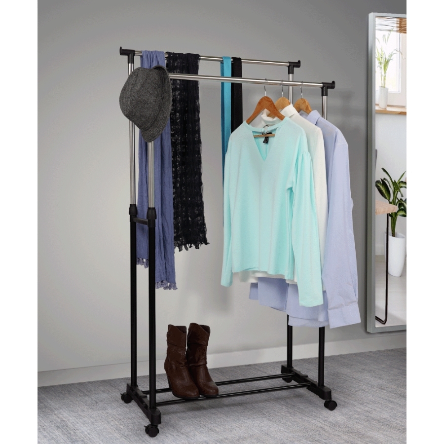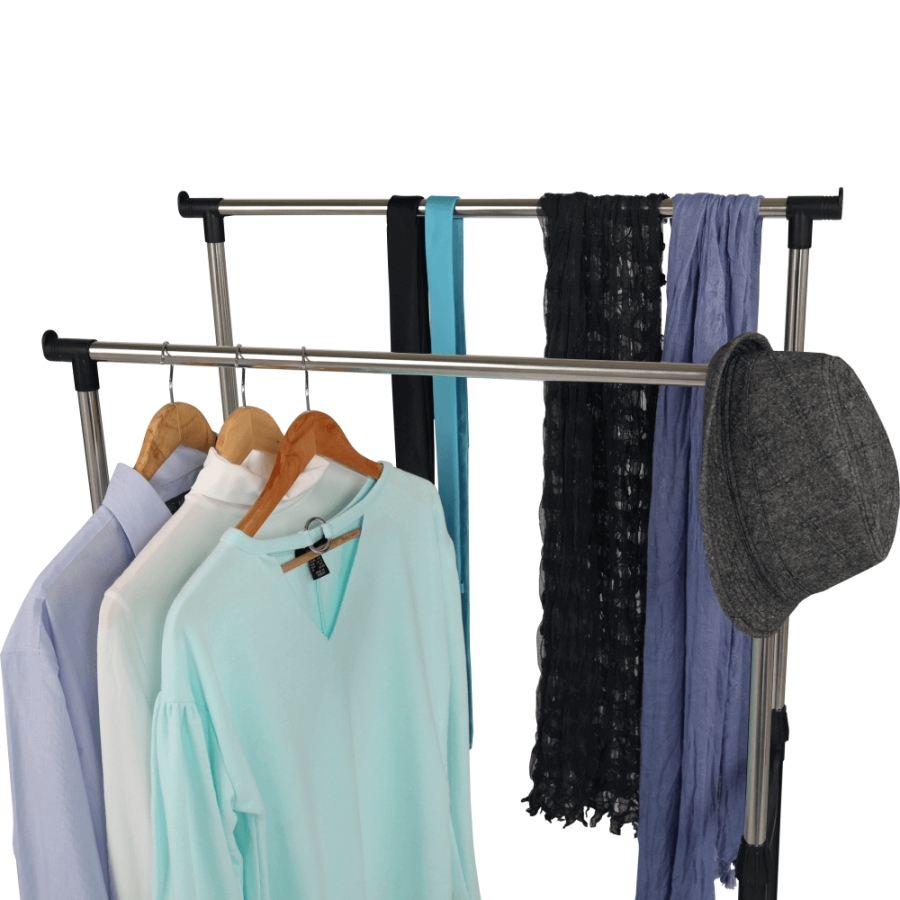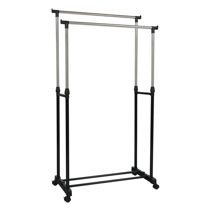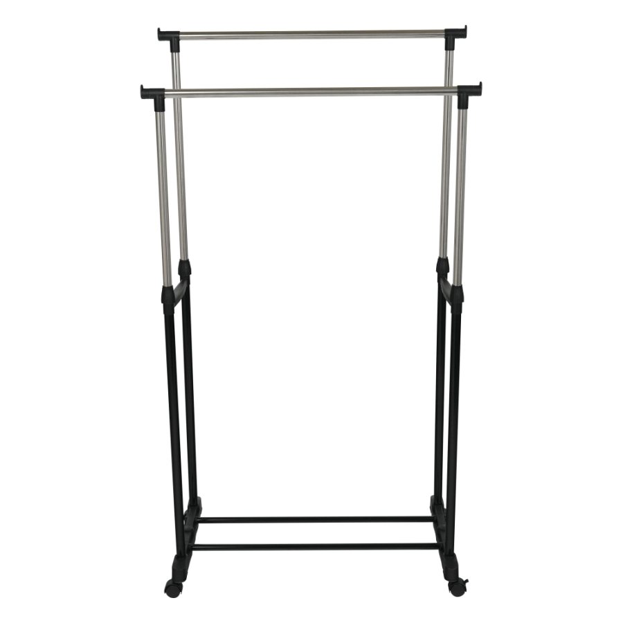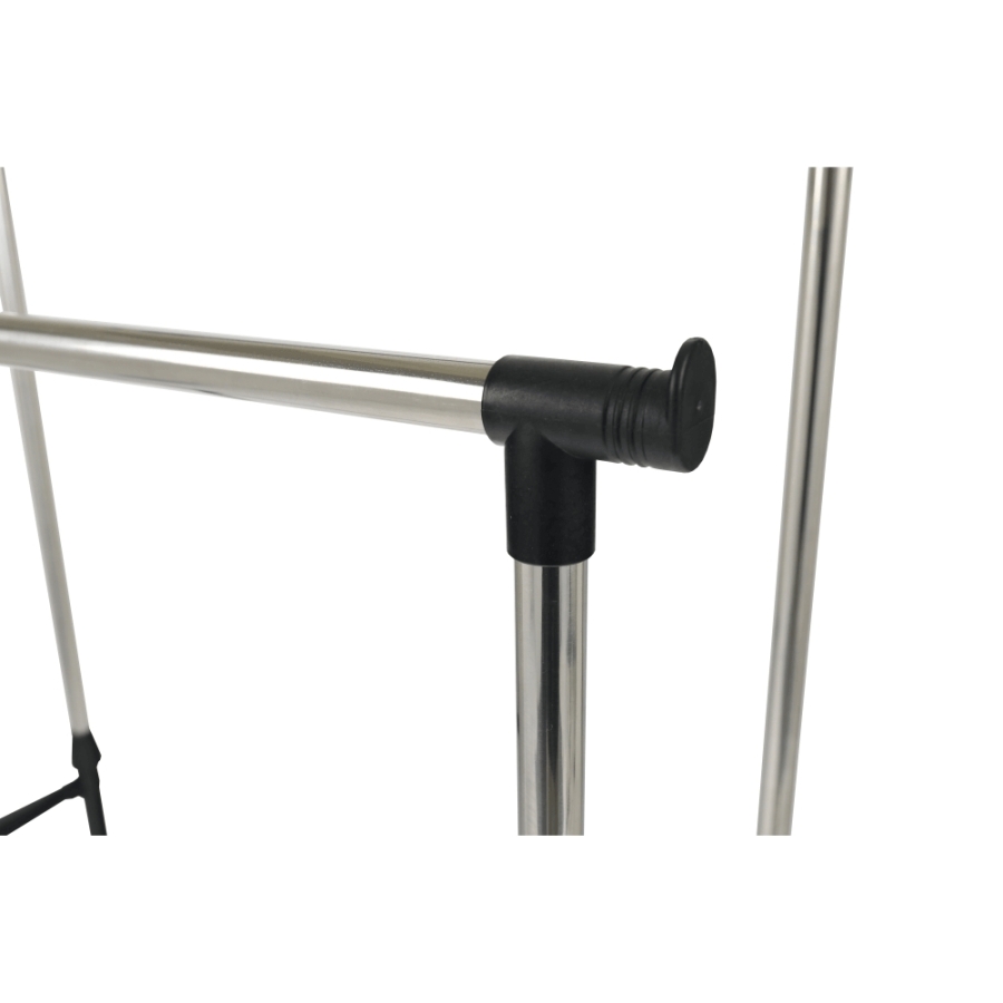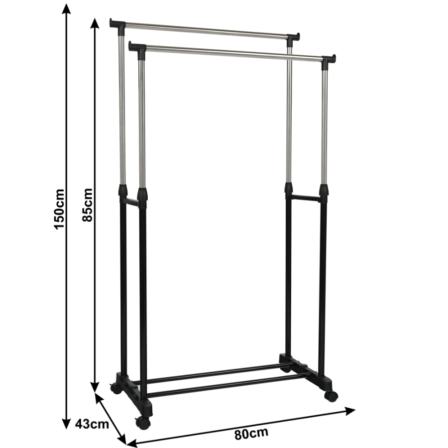 OLIVER görgős ruhaállvány két állítható magasságú rúddal Változat: rozsdamentes fém + fekete műanyag Méretek (SzéxMéxMa): 80x43x85-150 cm