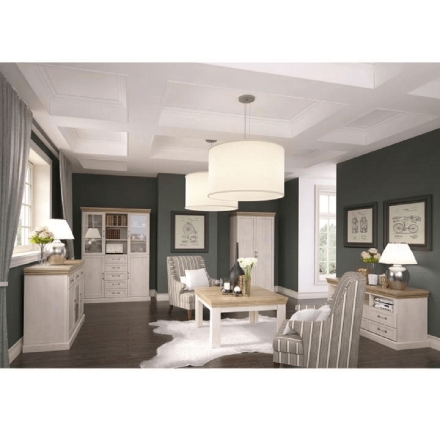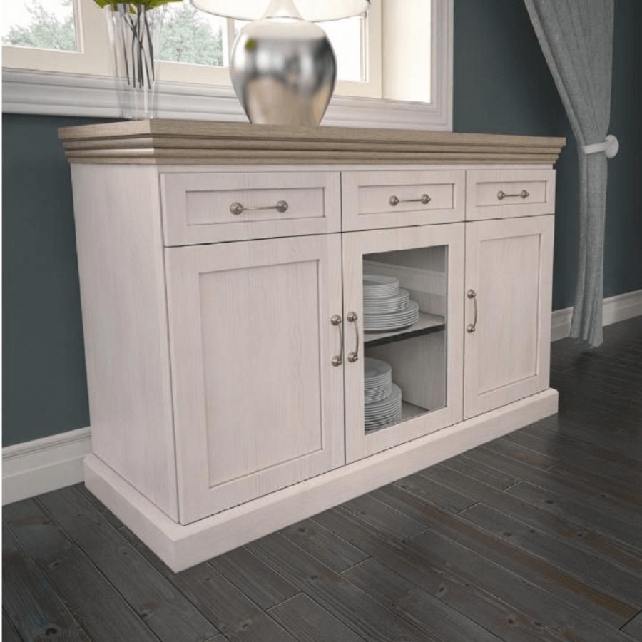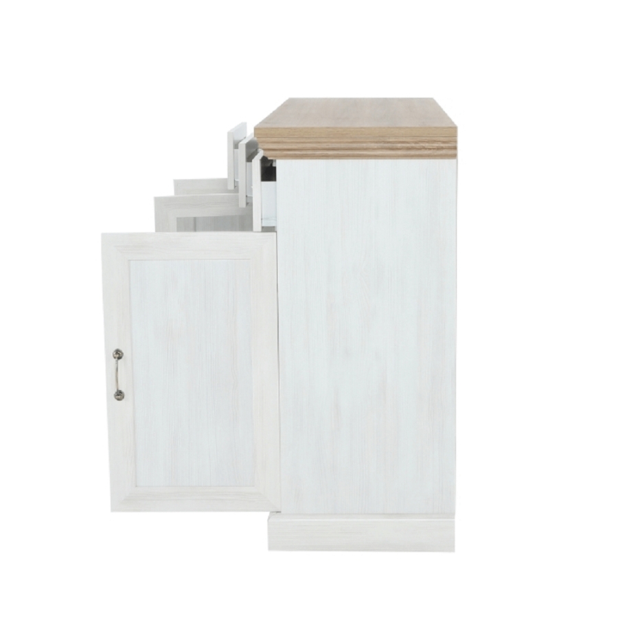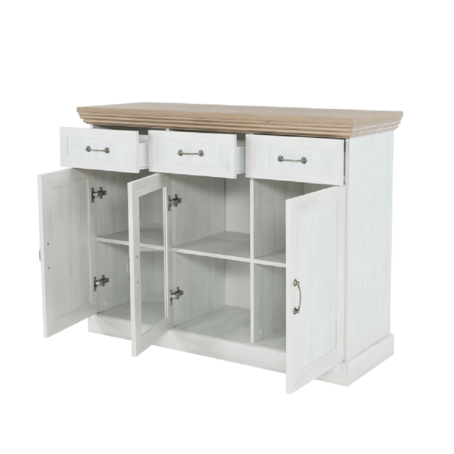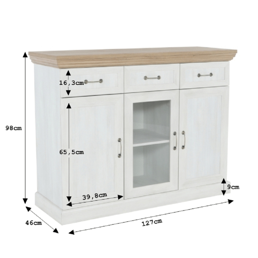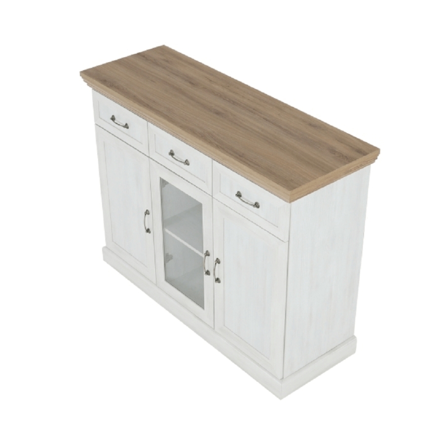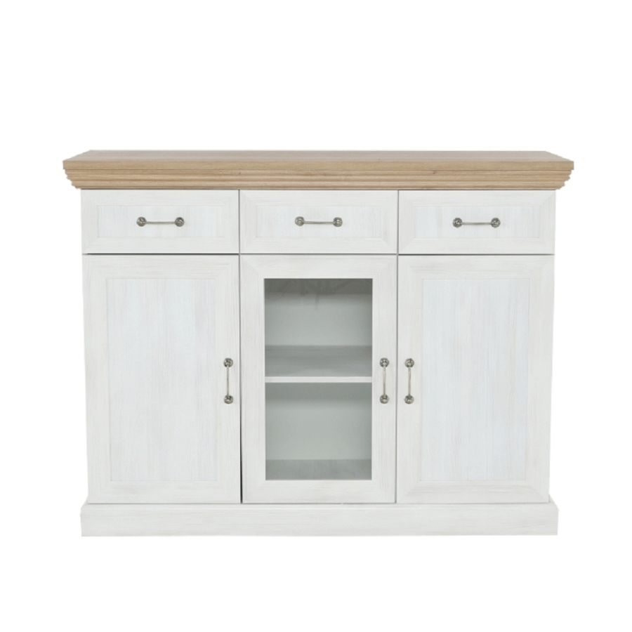 Komód K1S, háromajtós, három fiókkal, az elegáns provence-i stílusú ROYAL elemes bútorcsaládból Ideális a nappaliba vagy a hálószobába. Anyag: váz laminált DTD + díszlécek, fém fogantyúk Színváltozat: északi fenyő vad tölggyel kombinálva Méretek (SzéxMéxMa): 127x46x98 cm Váz vastagsága: 15 mm Felsőlap vastagsága: 22 mm Szállítás: lapraszerelten