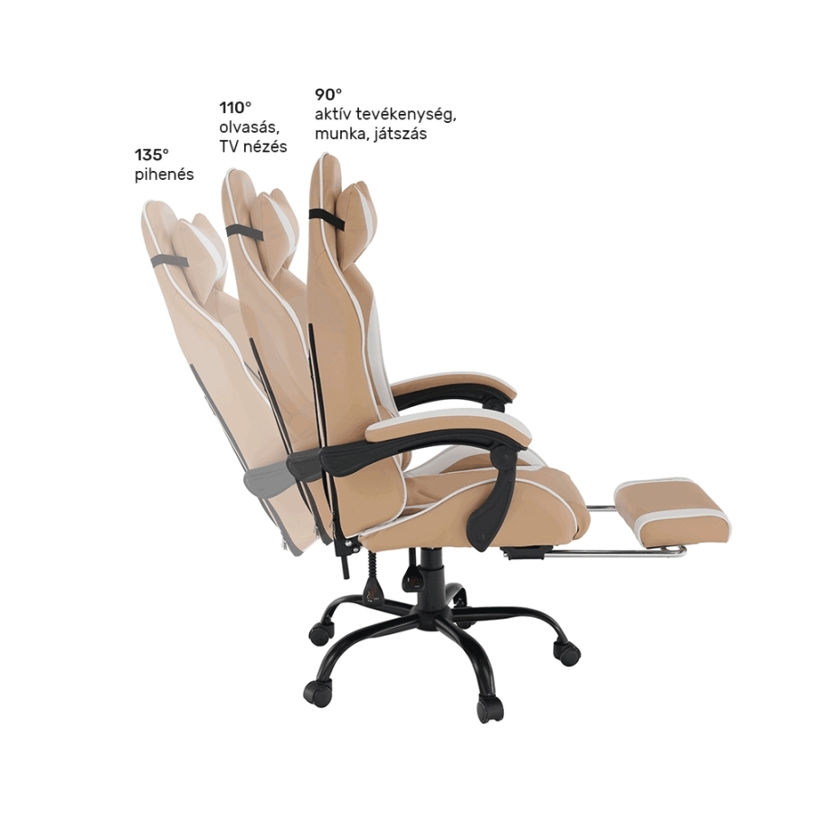 Anyag: textilbőr/műszövet/háló A textilbőr kopásállósága: 100 000 Martindale A szövet kopásállósága: 90 000 Martindale Szín: fekete/fehér/bézs Méretei (SzéxMéxMa): 64x60x126-136 cm Állítható ülésmagasság : 47-57 cm Ülésmélység: 49 cm Ülésszélesség: 50 cm Háttámla magassága: 83 cm Háttámla szélessége: 52 cm Teherbírás: 120 kg Forgó Hinta mechanizmus Játék Párna a hát és fej tájékán Kihúzható lábtartóval Kerekek sportautókerék dizájnnal Kárpitozott kéztámasz Állítható háttámla Ergonomikus alak Hosszú üléshez ideális Bontásban szállítva