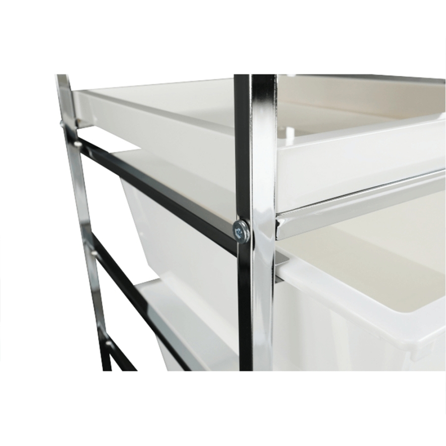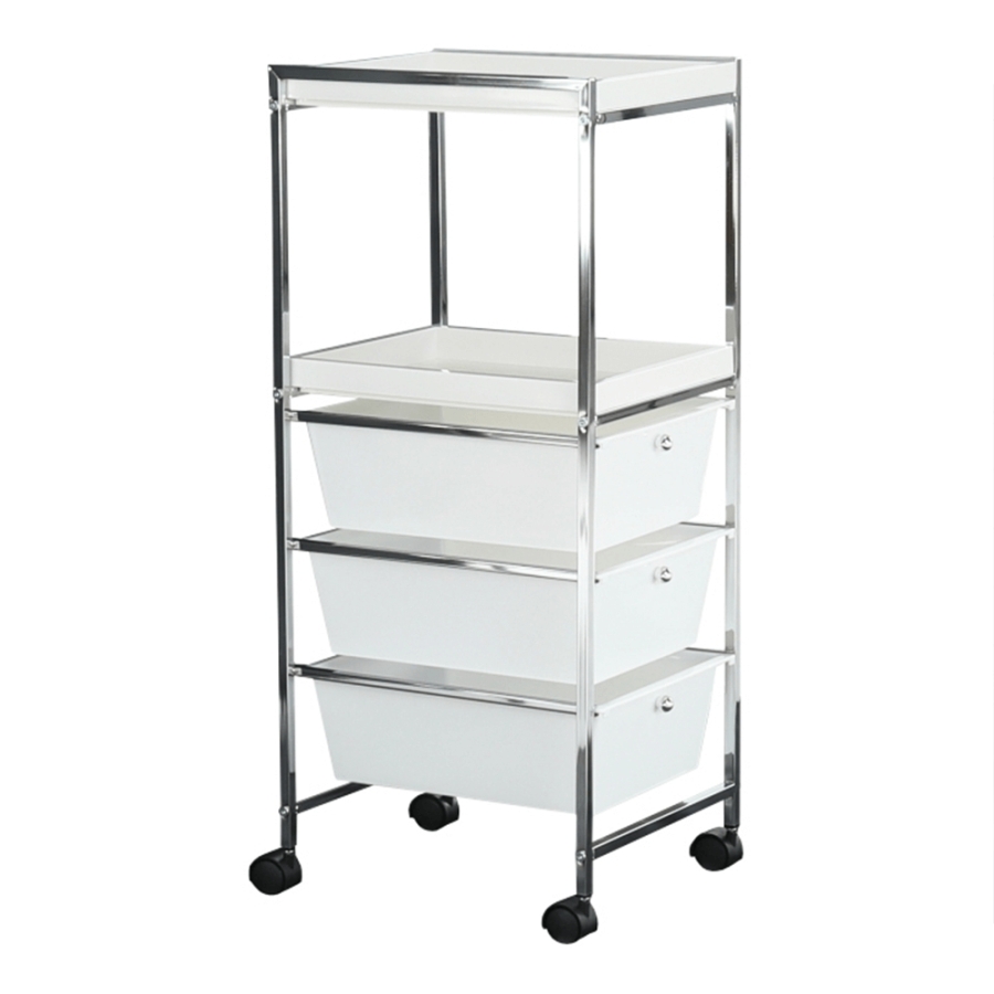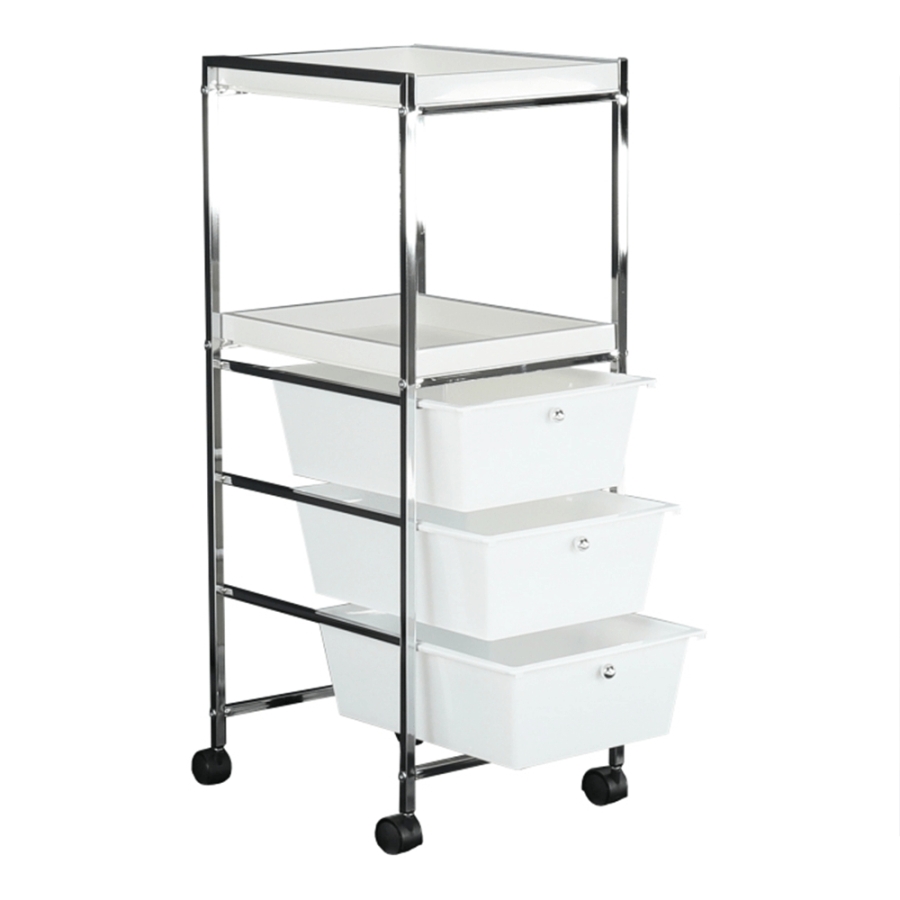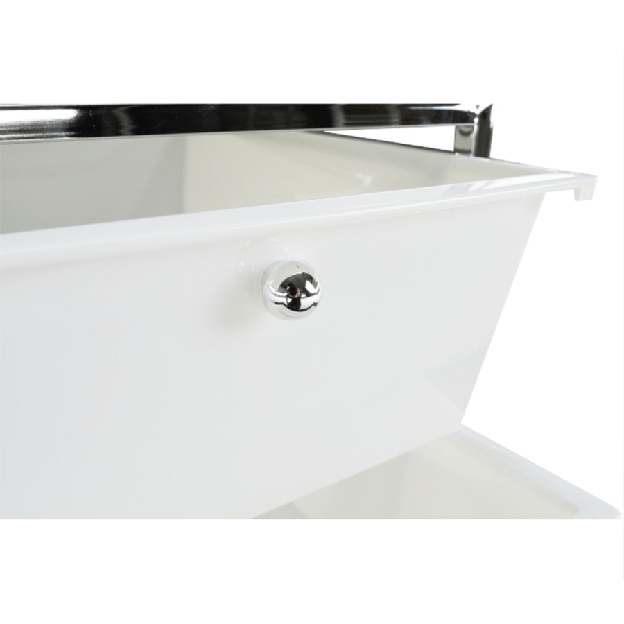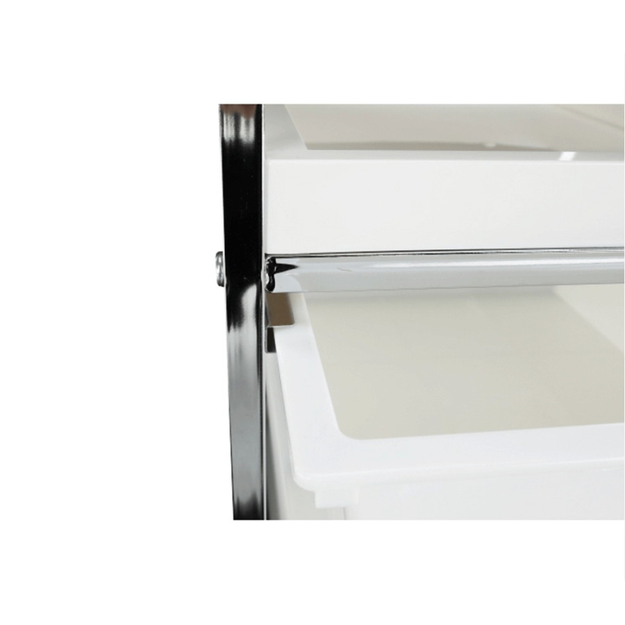Kerekes polc CORFU Három fiók/ két polc/ kerekekkel Szín: fehér/króm Anyag: műanyag/fém Méretek (SzéxMéxMa): 31,3x36,5x85,5 cm. Szállítás szétszerelve.