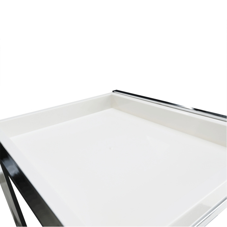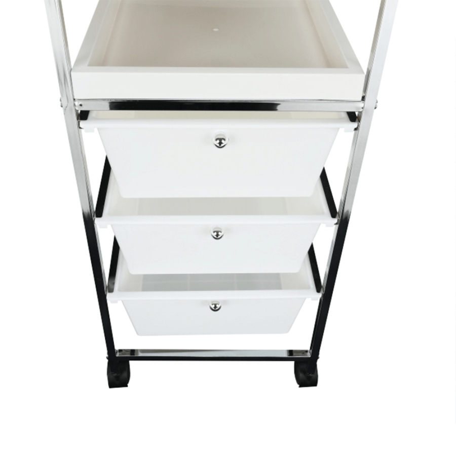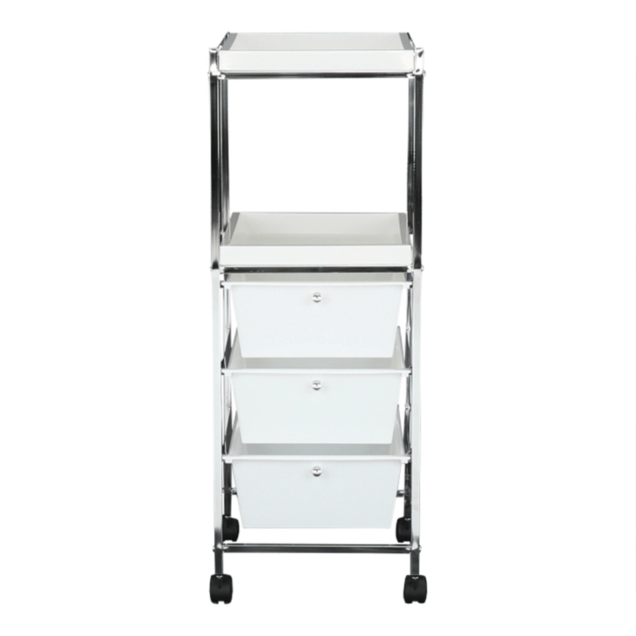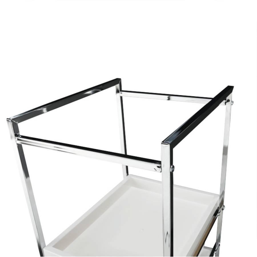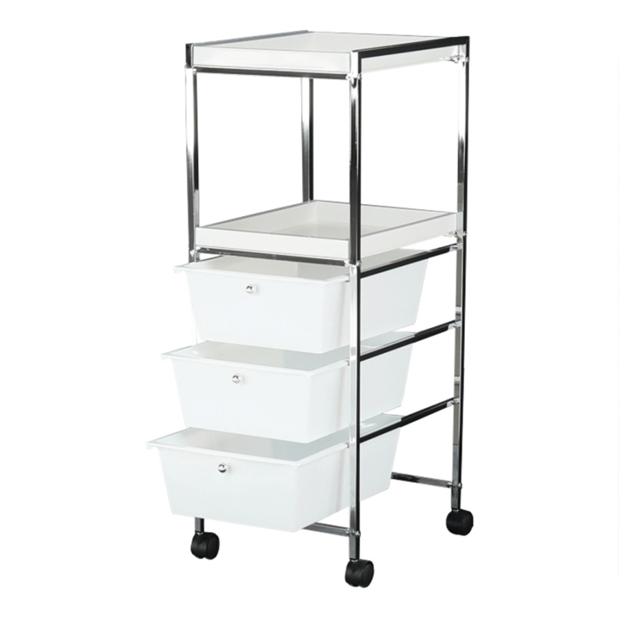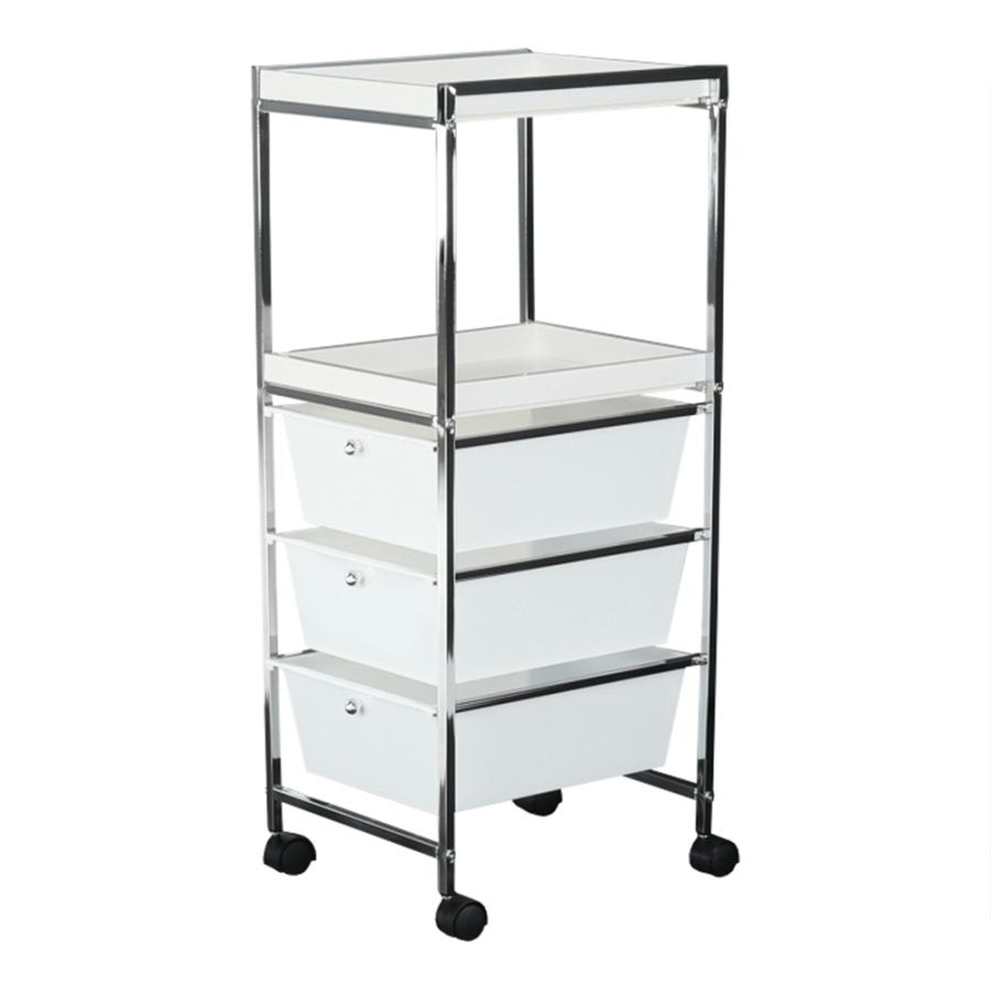 Kerekes polc CORFU Három fiók/ két polc/ kerekekkel Szín: fehér/króm Anyag: műanyag/fém Méretek (SzéxMéxMa): 31,3x36,5x85,5 cm. Szállítás szétszerelve.