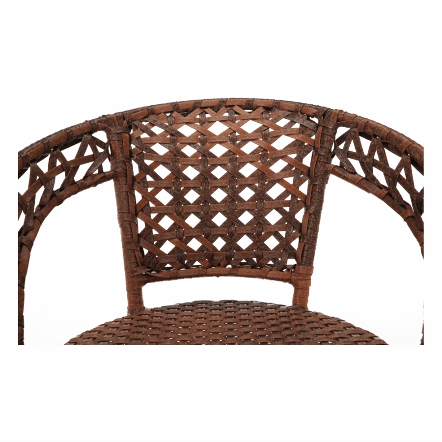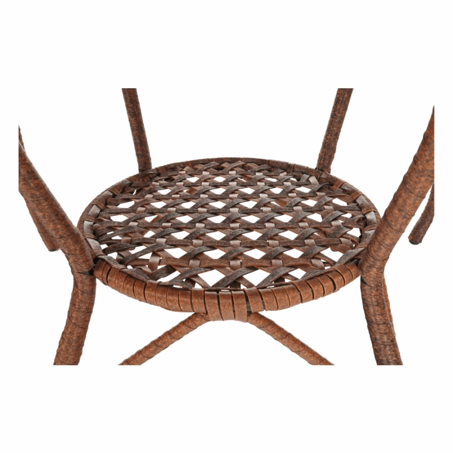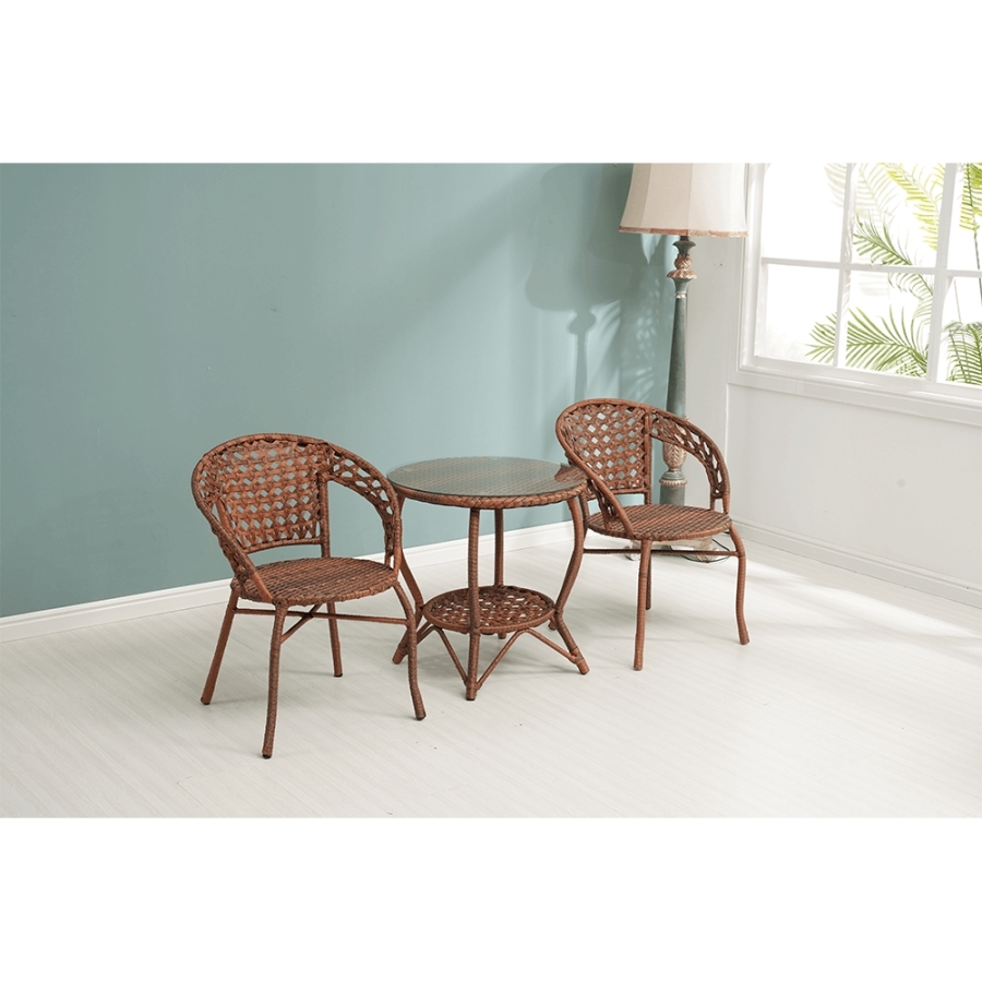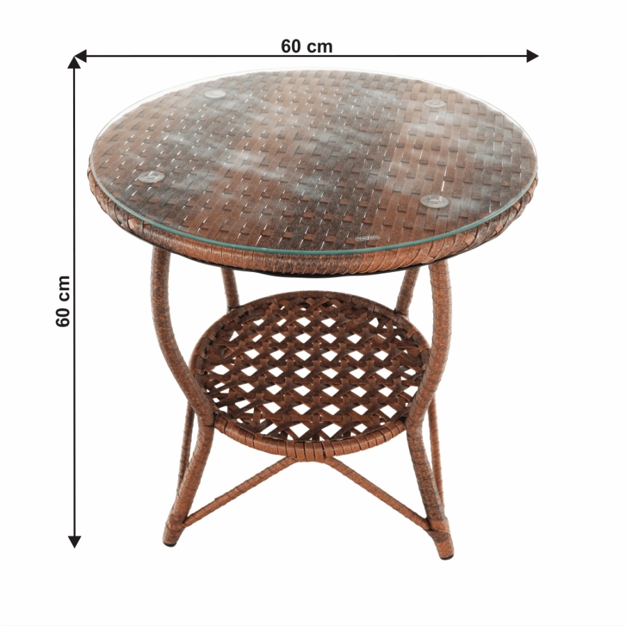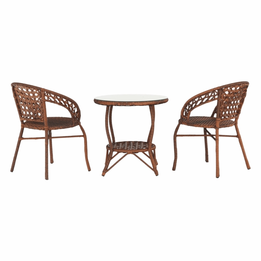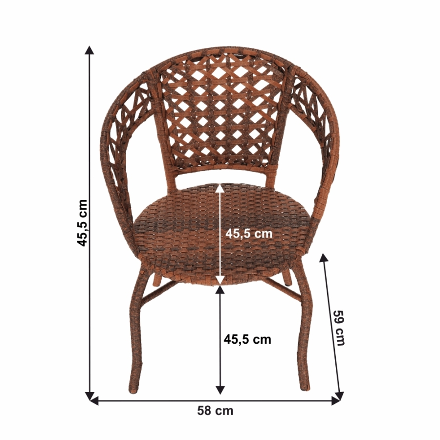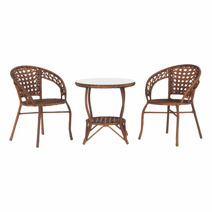 Anyag: technorattan/acél/edzett üveg Szín: barna Asztal méretei (átlóxMa): 60x60 cm Szék méretei (SzéxMéxMa): 58x59x74 cm Ülésmélység: 45,5 cm Ülésmagasság: 41 cm Szék teherbírása: 90 kg 3-részes Egy asztal Két szék Rakásolható fotel/szék Egészben szállítva.