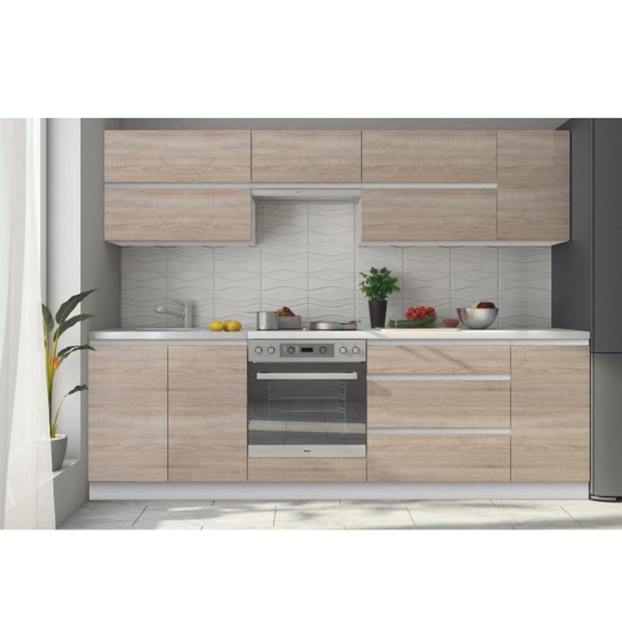 Alapkonyha: a váz DTD laminált sonoma tölgyfa, ajtók - , vagy a váz fehér magasfényű HG DTD laminált fehér/ajtók sonoma tölgyfa. Felső méret a füstelszívó szekrénykével: 2,6 m, alsó méret: 2,6 m,