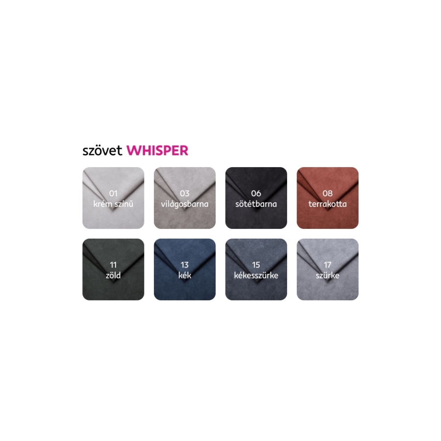 A Whisper szövet 8 színváltozatában megrendelhető, 6-8 hét szállítási idővel, ár: 590.900 Ft. Egyedi megrendelés esetén a megadott összeg 10%-át előlegként szükséges befizetni. Az előleg befizetése után kérése a gyártásba kerül.