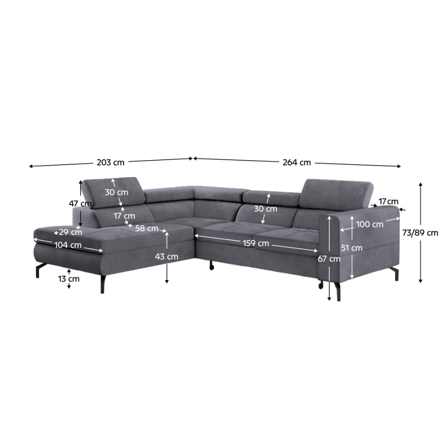 Méretek (SzxMéxMa): 264x203x73/89 cm