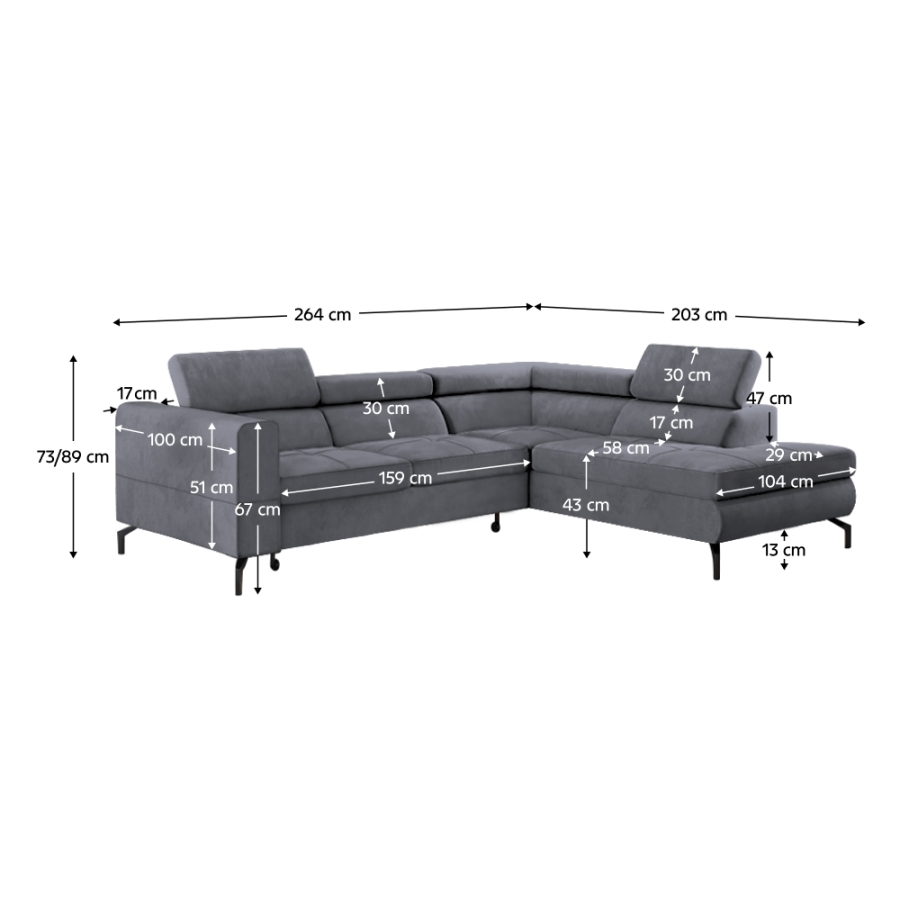 Méretek (SzxMéxMa): 264x203x73/89 cm