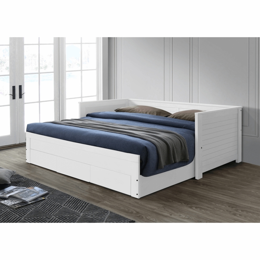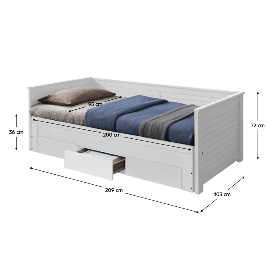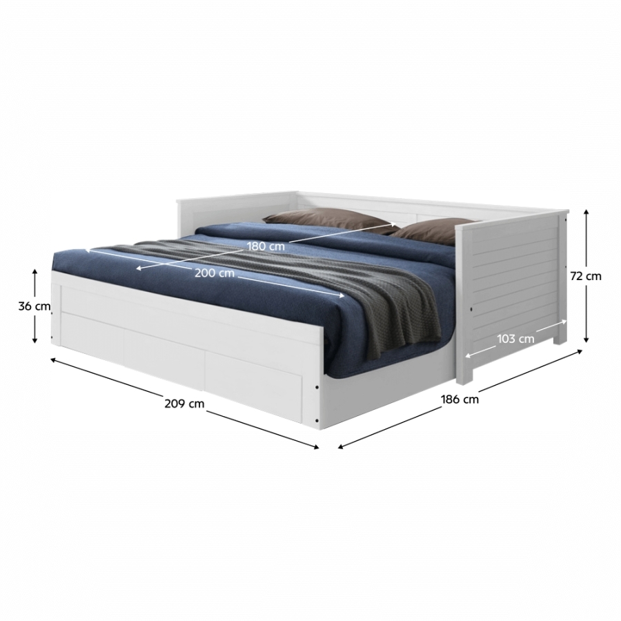 Ágy 3 fiókkal, GORETA Anyag: tömörfa / MDF Változat: fehér Mérete (SzéxMéxMa): 209x103x72 cm Ágy mérete (SzéxMéxMa): 90x200 cm Fekvőfelület kinyitás után: 180x200 cm Terhelhetőség: 110 kg Magasság az ágyrácsig: 36 cm Ágyráccsal Oldalsó háttámlával 3 fiókkal Szállítás matrac nélkül Lapraszerelten szállítva Ha duplaágyként szeretné ezt az ágyat használni, ajánlatos a 90x200 cm-es matrac rendelése kínálatunkból. Ha ágyként szeretné ezt az ágyat használni, javasoljuk 85x200 cm-es és 95x200 cm-es matrac rendelését kínálatunkból.