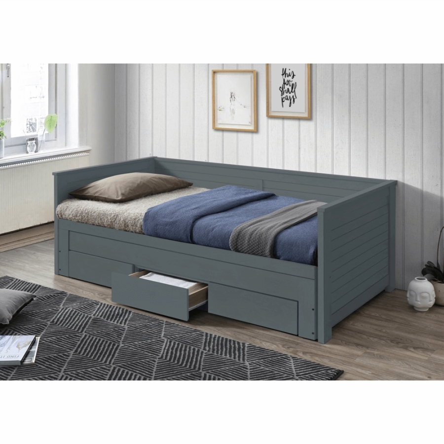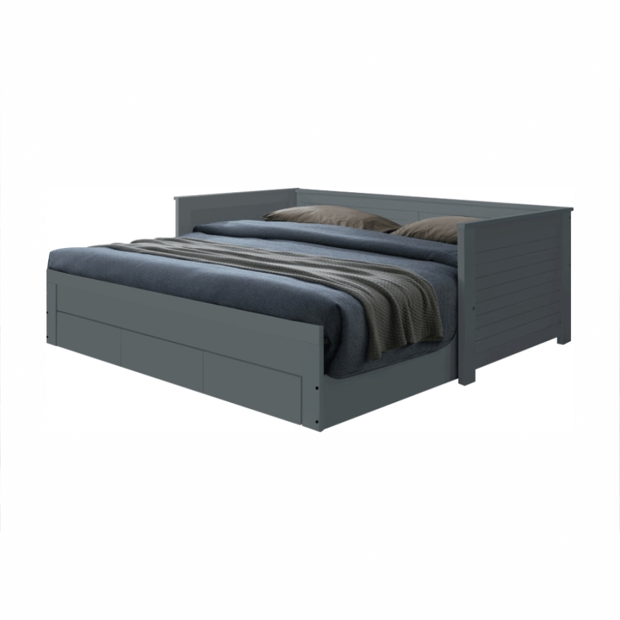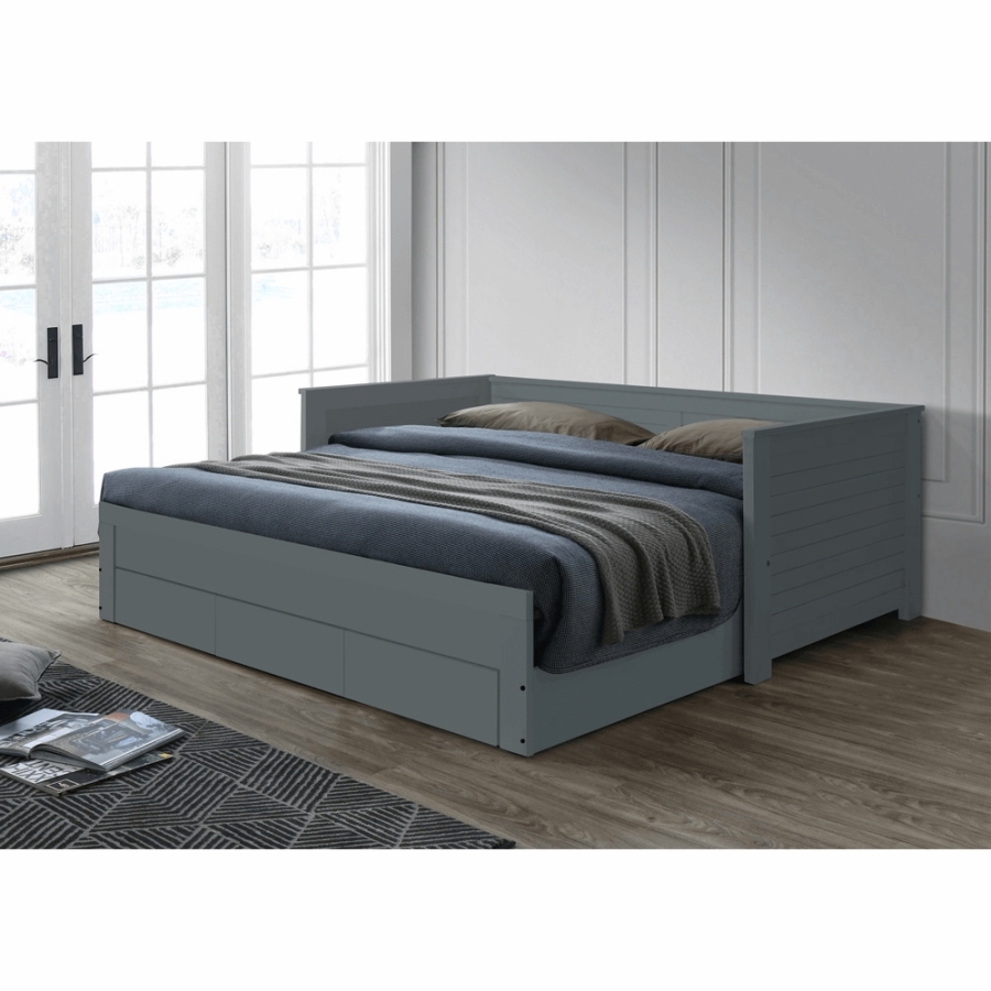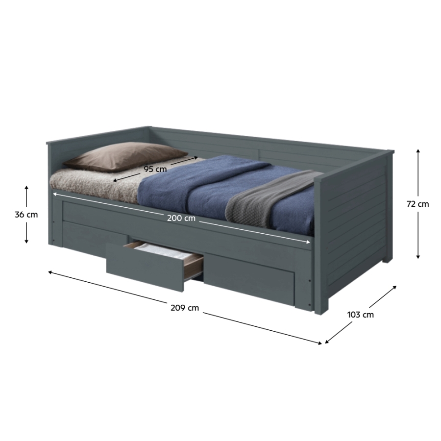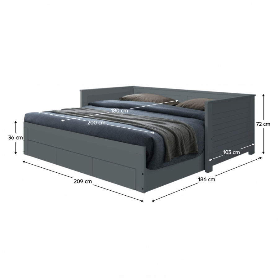 Ágy 3 fiókkal, GORETA Anyag: tömörfa / MDF Változat: szürke Mérete (SzéxMéxMa): 209x103x72 cm Ágy mérete (SzéxMéxMa): 90x200 cm Fekvőfelület kinyitás után: 180x200 cm Magasság az ágyrácsig: 36 cm Terhelhetőség: 110 kg Ágyráccsal Oldalsó háttámlával 3 fiókkal Szállítás matrac nélkül Lapraszerelten szállítva *Azágyhoz szükséges matracot vásárolni. Ha ágyat vásárol, és kinyitva, franciaágyként tervezi használni, akkor a 90x200-as méretű matracokat ajánlunk kínálatunkból. Ha az ágyat többnyire egyszemélyes ágyként fogja használni, akkor a 85x200 cm-es és 95x200 cm-es matracokat ajánlunk.