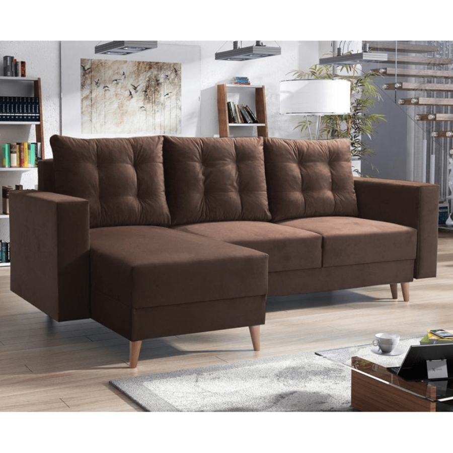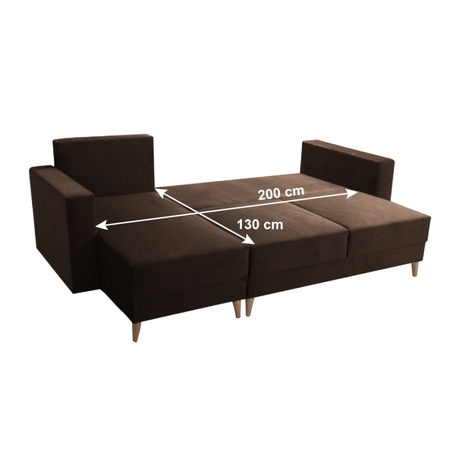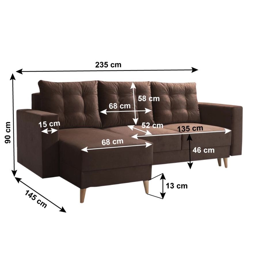 Kárpit anyaga: szövet Kronos 6 A szövet kopásállósága a Martindale teszt szerint: 60 000 ciklus Kárpit színe: barna Méretek (SzxMéxMa): 235x145x90 cm Alvófelület (SzxHo): 130x200 cm Ülés magassága: 46 cm Ülés mélysége: 52 cm Ottomán szélessége: 68 cm Ülőrész szélessége: 135 cm Karfa szélessége: 15 cm Az alsó tér magassága a padlótól: 13 cm Fa lábakon Lábak színe: tölgy Teherbírás/személy: 90 kg Töltet: falista rugó + poliuretán hab Három párnával szállítva Párnák méretei (SzxMa): 68x58 cm Kihúzható Sarok Teljesen kárpitozott Tárhellyel Balos kivitelezés Szétszerelve szállítva